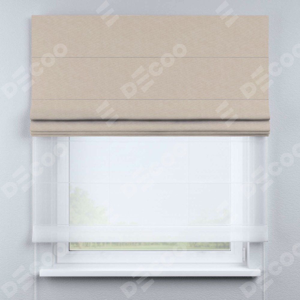 Римская штора день-ночь производителя «Cortin», используется для проёма, пошита из двух полотен, с лицевой стороны канвас кофе с молоком артикул v-07, вторая ткань тюль (по стандарту комплектуется тюль белого цвета артикул V-01). Имеет универсальный механизм и подходит для монтажа: на потолок, на стену и в нишу.