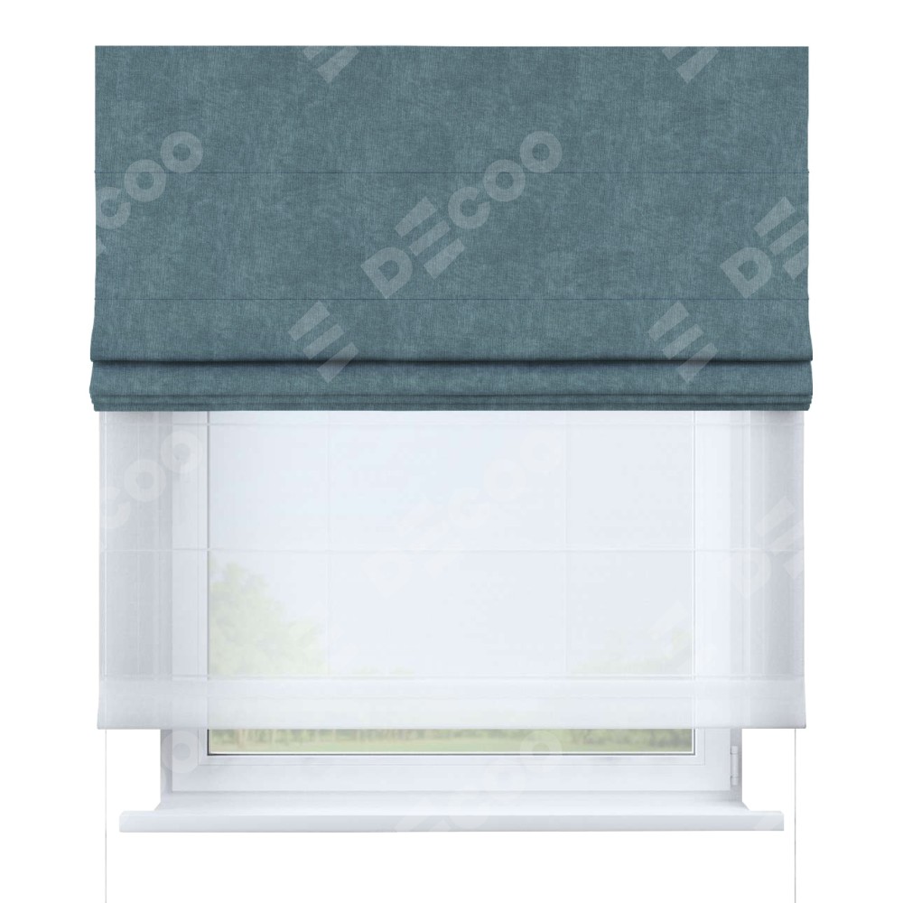 Римская штора день-ночь производителя «Cortin», используется для проёма, пошита из двух полотен, с лицевой стороны канвас серо-голубой артикул v-330, вторая ткань тюль (по стандарту комплектуется тюль белого цвета артикул V-01). Имеет универсальный механизм и подходит для монтажа: на потолок, на стену и в нишу.