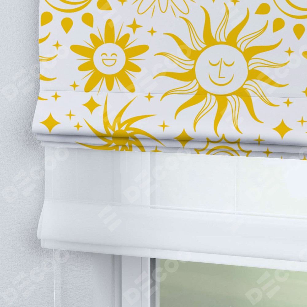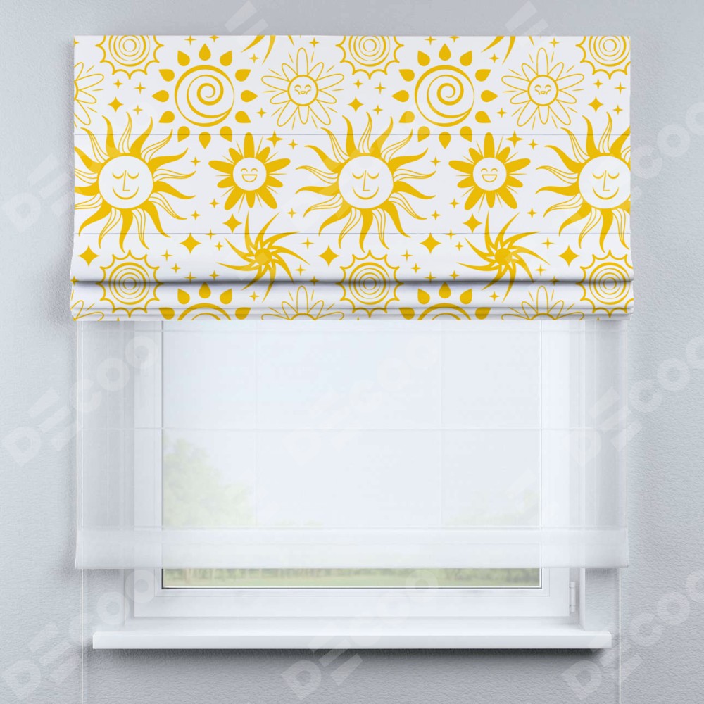 Римская штора день-ночь производителя «Cortin», используется для проёма, пошита из двух полотен, с лицевой блэкаут с нанесением сублимационной печати «Солнышки», вторая ткань тюль (по стандарту комплектуется тюль белого цвета артикул V-01). Имеет универсальный механизм и подходит для монтажа: на потолок, на стену и в нишу.