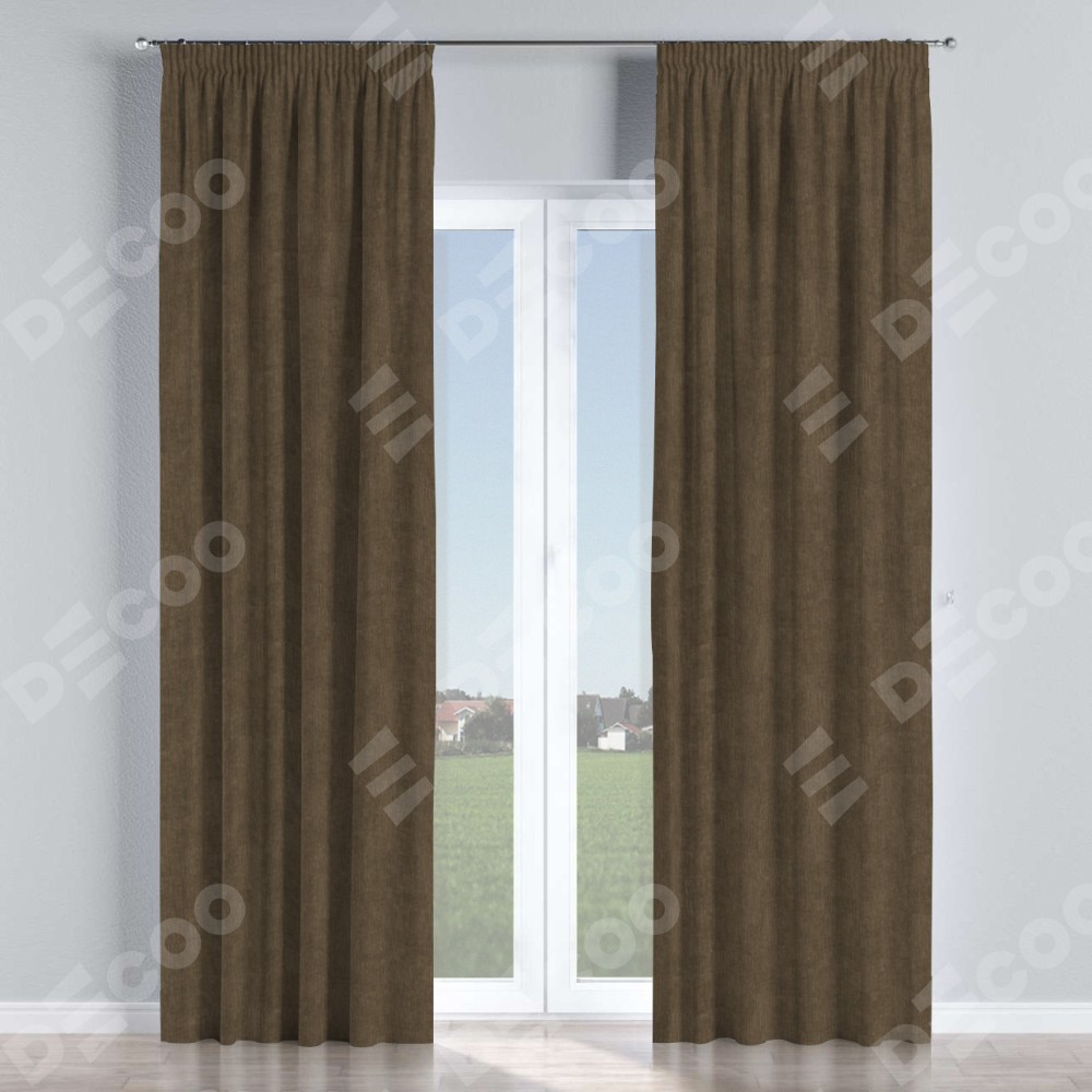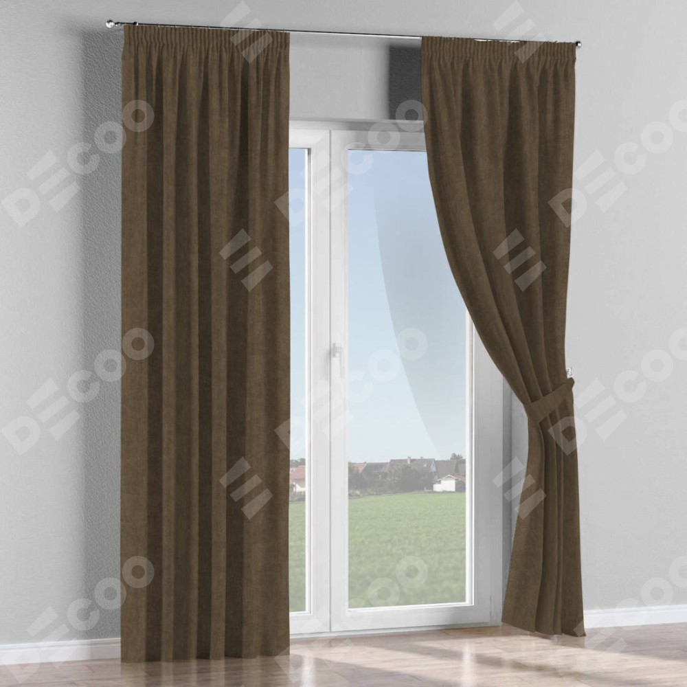 Комплект прямых штор, от производителя «Cortin», пошиты из ткани канвас шоколадный, артикул ткани v-193. С изнаночной стороны в верхней части штор пристрачивается шторная лента с декоративными складками «Карандаш». Для создания элегантных складок прямые шторы шьются по стандарту с коэффициентом 1:2 (на 100 см. ширины проёма 200 см. ширины ткани).
