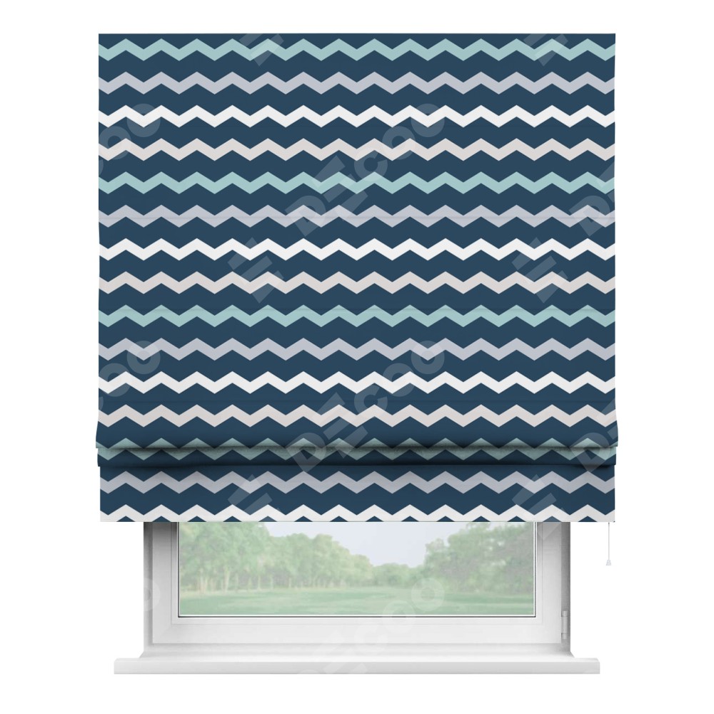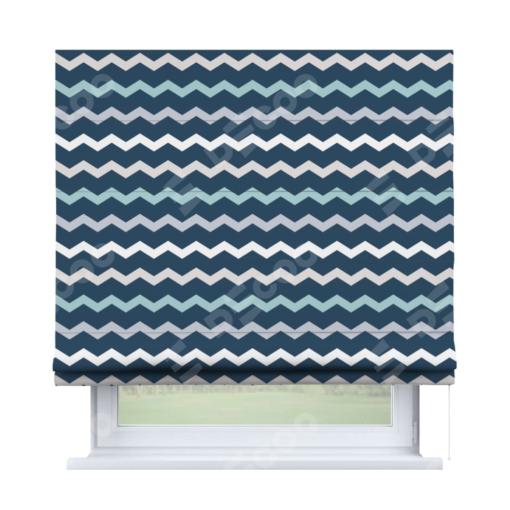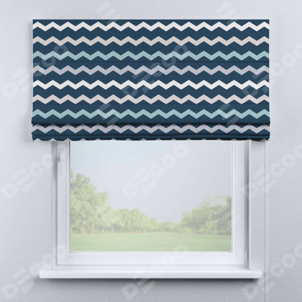 Римская штора производителя «Cortin», используется для проёма, пошита из ткани блэкаут с нанесением сублимационной печати «Морской шеврон». Имеет универсальный механизм и подходит для монтажа: на потолок, на стену и в нишу.