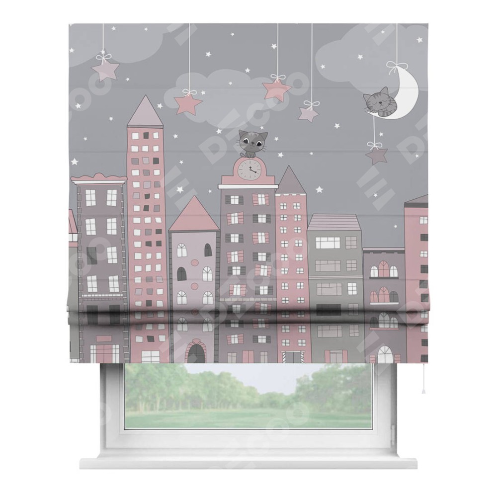 Римская штора производителя «Cortin», используется для проёма, пошита из ткани блэкаут с нанесением сублимационной печати «Вечерний город». Имеет универсальный механизм и подходит для монтажа: на потолок, на стену и в нишу.