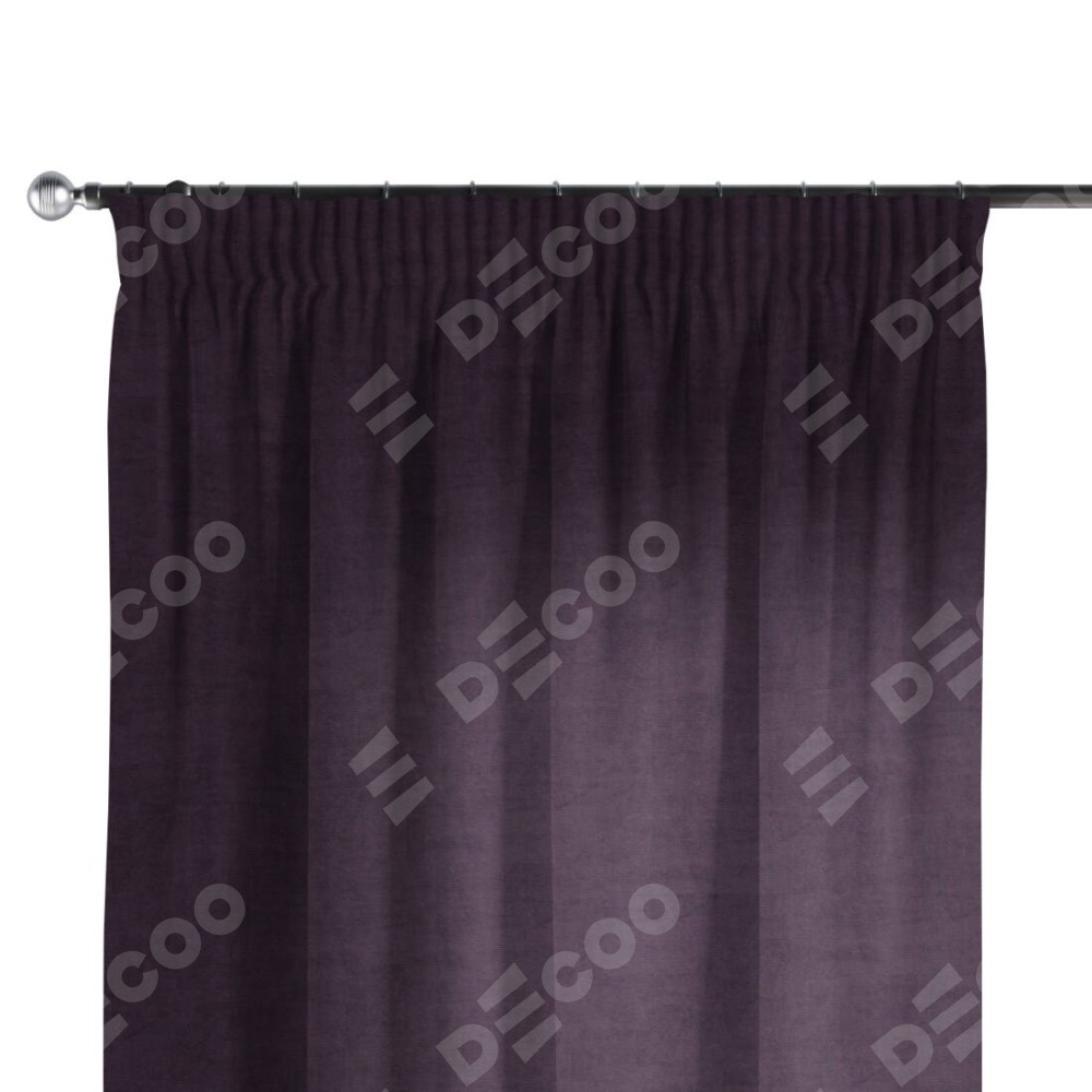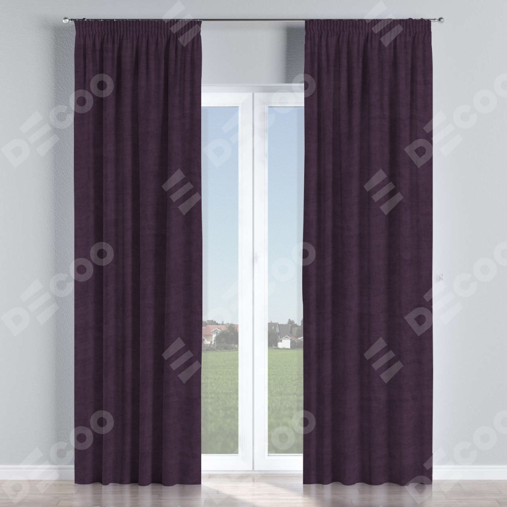 Комплект прямых штор, от производителя «Cortin», пошиты из ткани вельвет тёмно-фиолетовый, артикул ткани 72403. С изнаночной стороны в верхней части штор пристрачивается шторная лента с декоративными складками «Карандаш». Для создания элегантных складок прямые шторы шьются по стандарту с коэффициентом 1:2 (на 100 см. ширины проёма 200 см. ширины ткани).