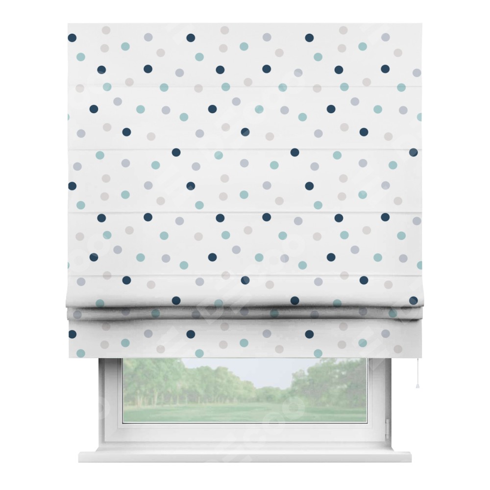 Римская штора производителя «Cortin», используется для проёма, пошита из ткани блэкаут с нанесением сублимационной печати «Точки». Имеет универсальный механизм и подходит для монтажа: на потолок, на стену и в нишу.