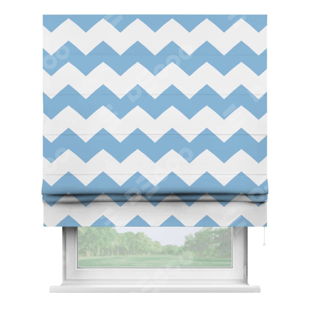 Римская штора производителя «Cortin», используется для проёма, пошита из ткани блэкаут с нанесением сублимационной печати «Зигзаг крупный». Имеет универсальный механизм и подходит для монтажа: на потолок, на стену и в нишу.