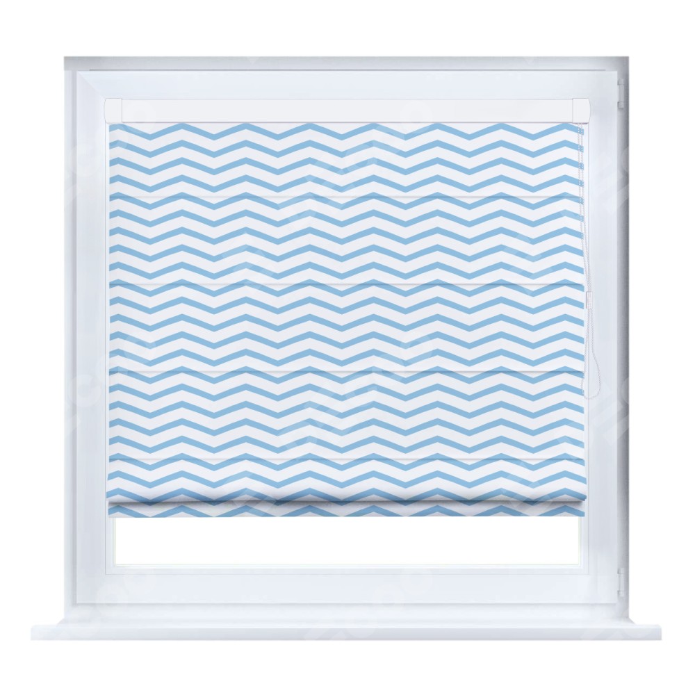 Римская штора кассетного типа, производителя «Cortin», устанавливается только на пластиковые окна и прилегает к стеклопакету, пошита из ткани блэкаут с нанесением сублимационной печати «Зигзаг мелкий».