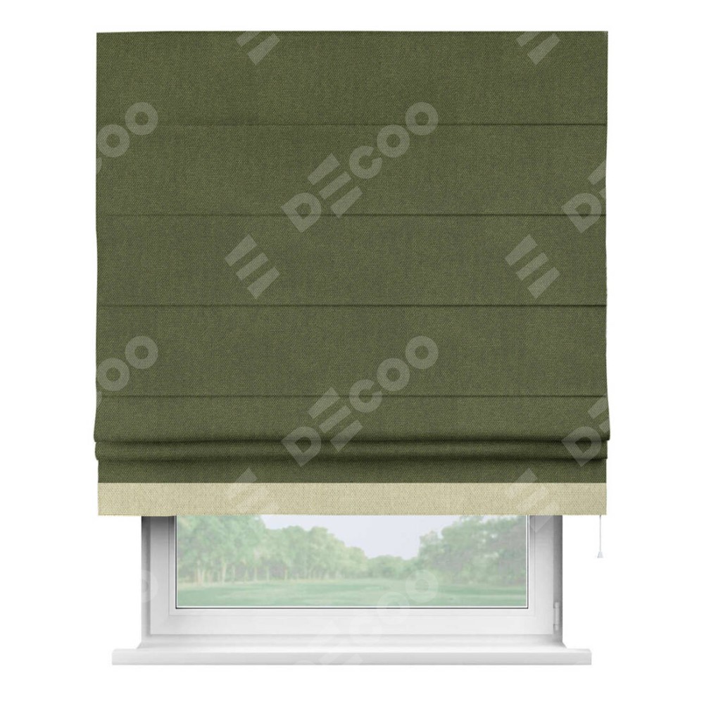 Римская штора производителя «Cortin», используется для проёма, пошита из ткани лён димаут салатовый, артикул 91002. Отделка шторы кантом «Джестер», ткань для канта используется из льна димаут разной расцветки на выбор. Имеет универсальный механизм и подходит для монтажа: на потолок, на стену и в нишу.