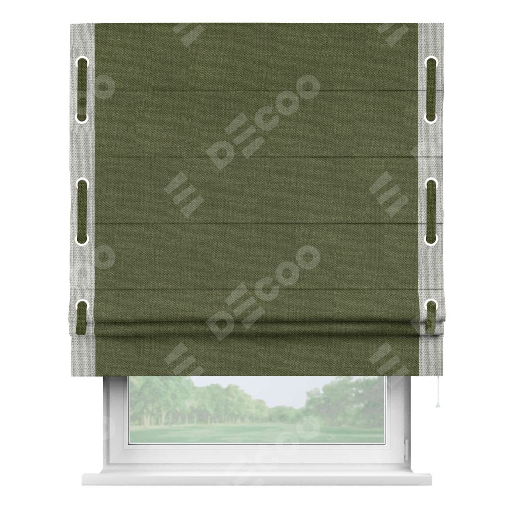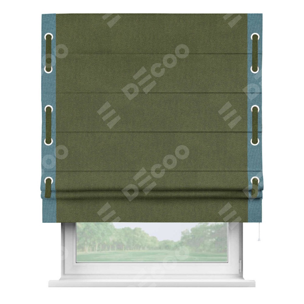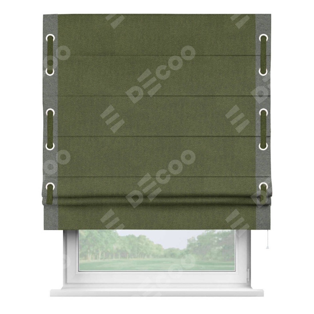 Римская штора производителя «Cortin», используется для проёма, пошита из ткани лён димаут салатовый, артикул 91002. Отделка шторы кантом «Стрим Дуо» на кантах расположены люверсы с пояском, ткань для канта используется лён димаут разной расцветки на выбор. Ткань для пояска обычно используется из основной ткани шторы, а так же можно сделать из любой расцветки по желанию. Имеет универсальный механизм и подходит для монтажа: на потолок, на стену и в нишу.
