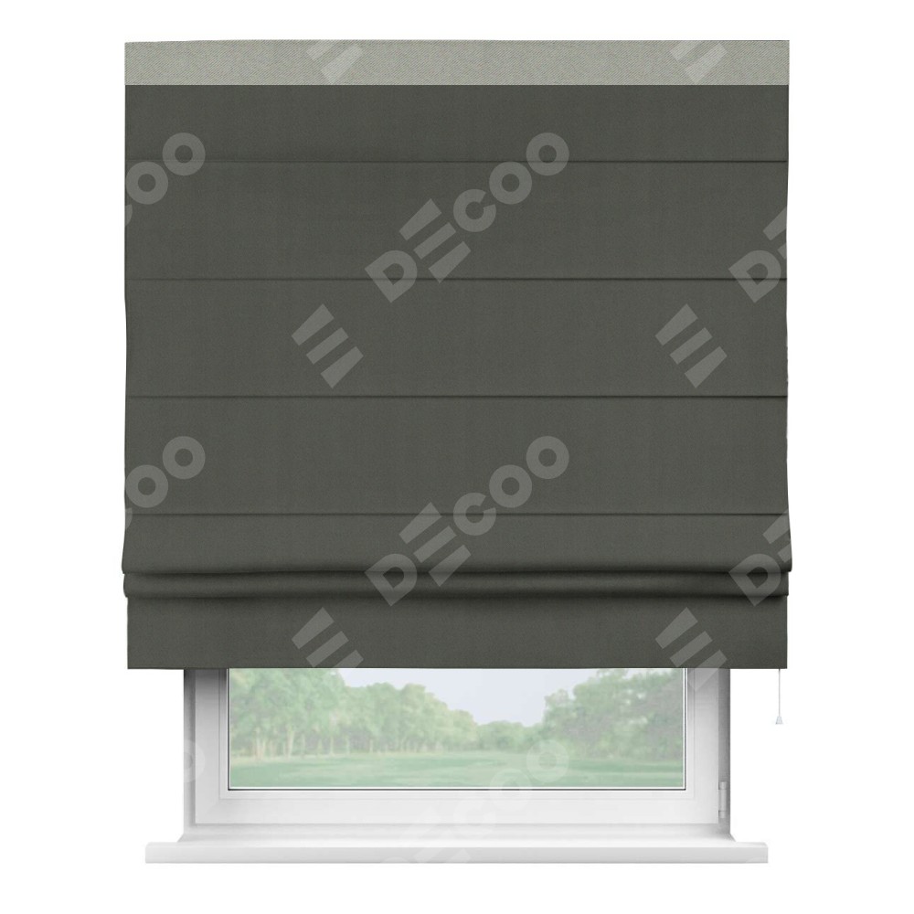 Римская штора производителя «Cortin», используется для проёма, пошита из ткани блэкаут однотонный дымчато-серый, артикул ткани 91571−1. Отделка шторы кантом «Кинг», ткань для канта используется из блэкаута однотонного разной расцветки на выбор. Имеет универсальный механизм и подходит для монтажа: на потолок, на стену и в нишу.
