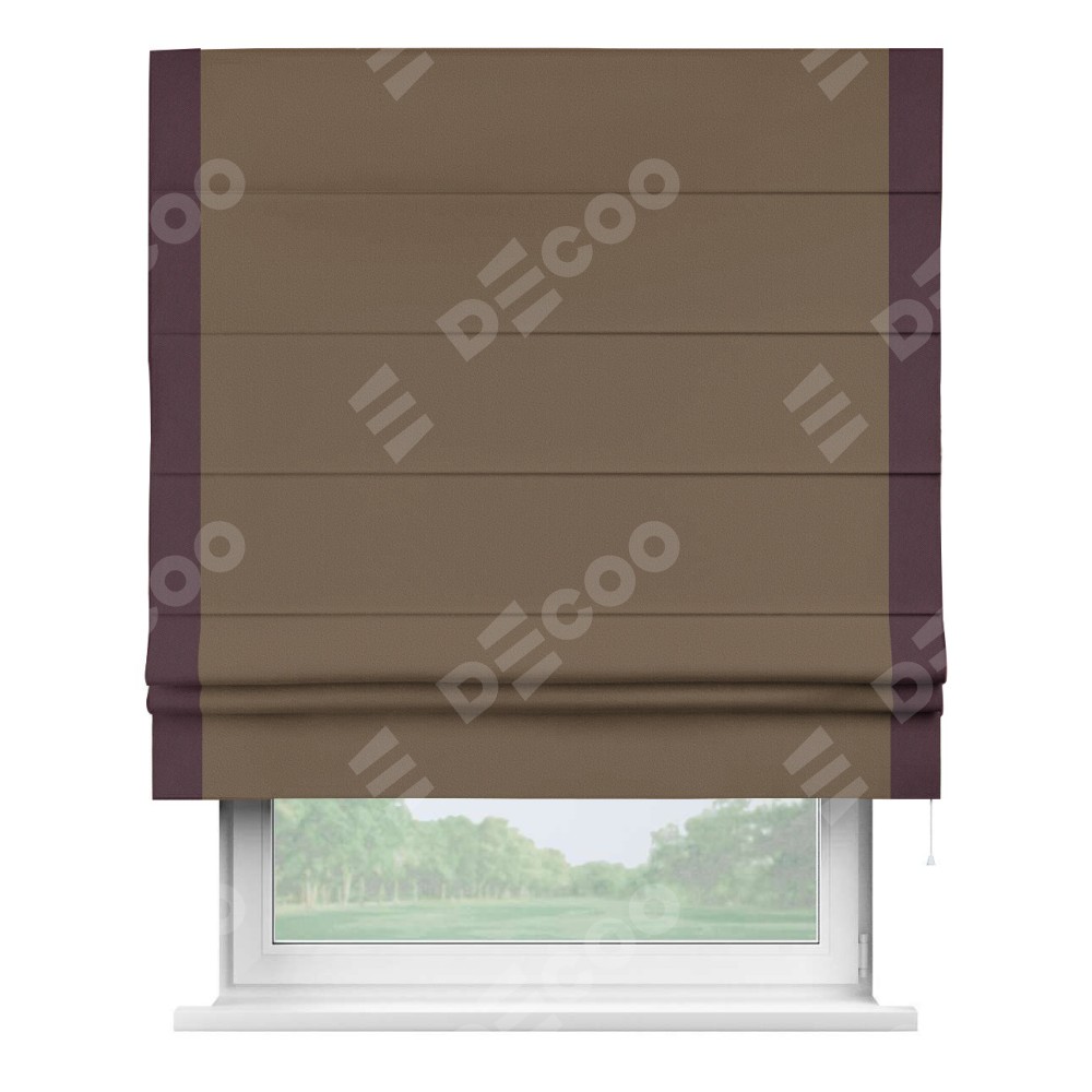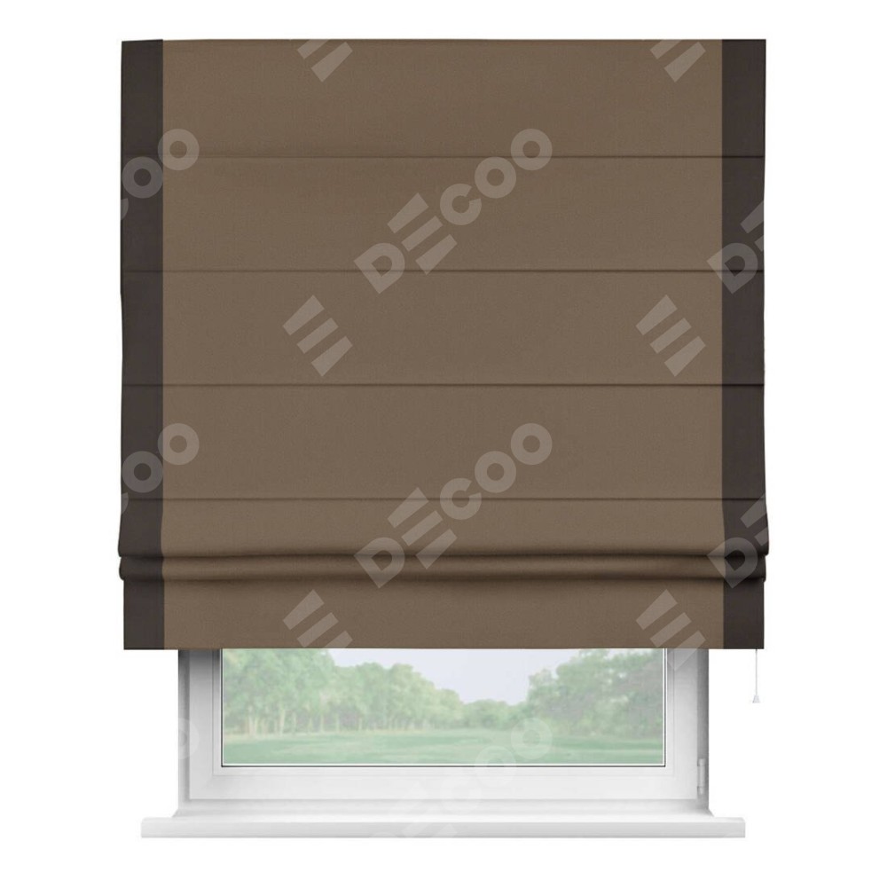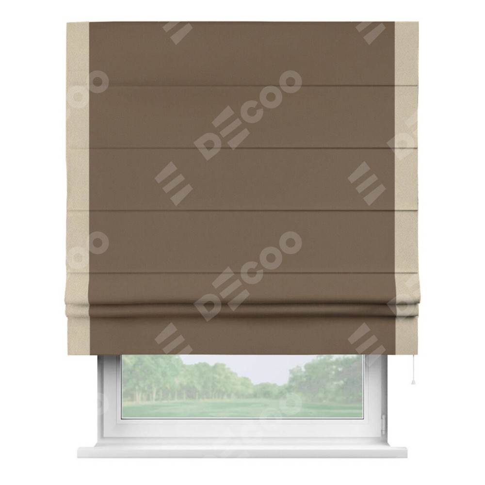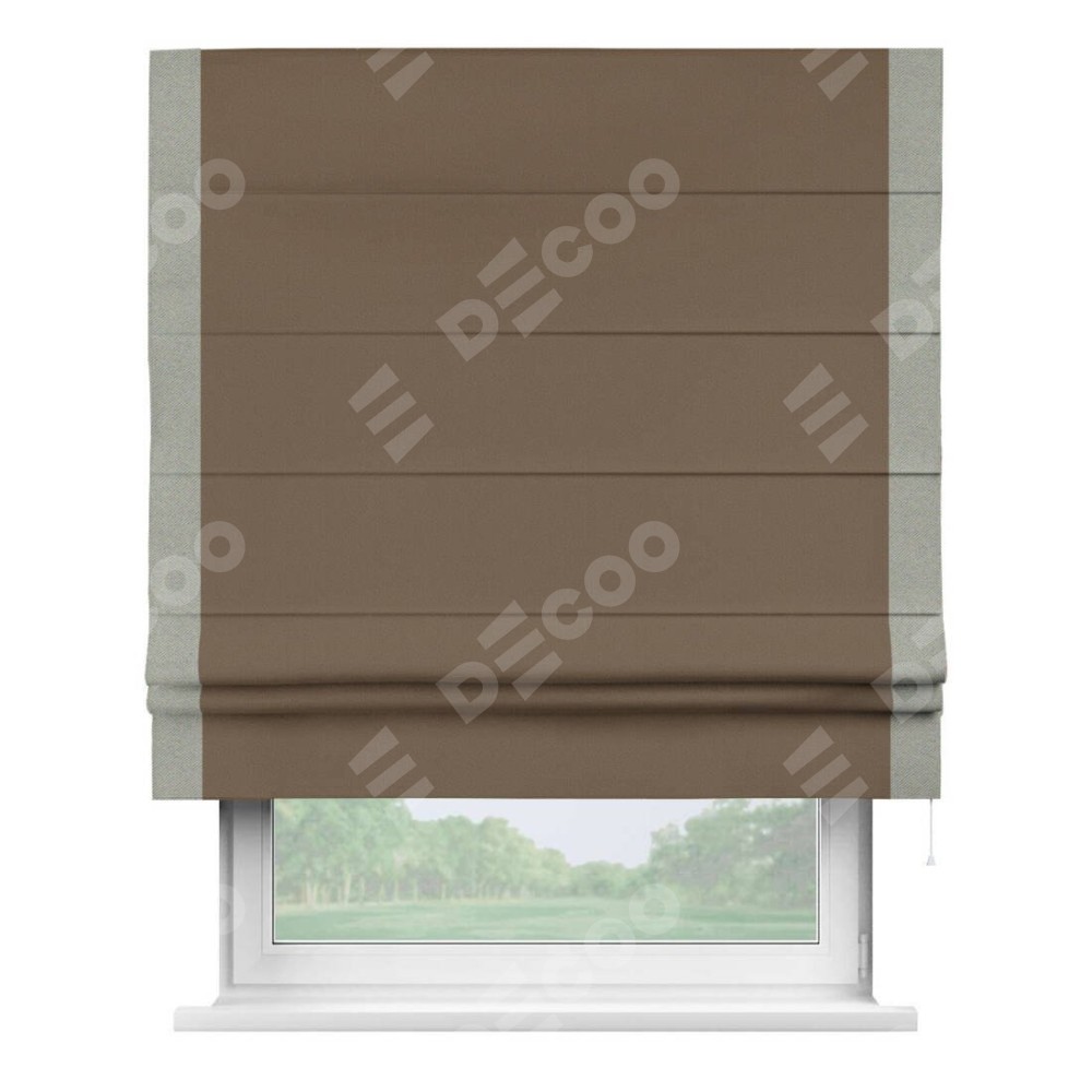Римская штора производителя «Cortin», используется для проёма, пошита из ткани блэкаут однотонный коричневый, артикул ткани 91334. Отделка шторы кантом «Стрим Дуо», ткань для канта используется из блэкаута однотонного разной расцветки на выбор. Имеет универсальный механизм и подходит для монтажа: на потолок, на стену и в нишу.