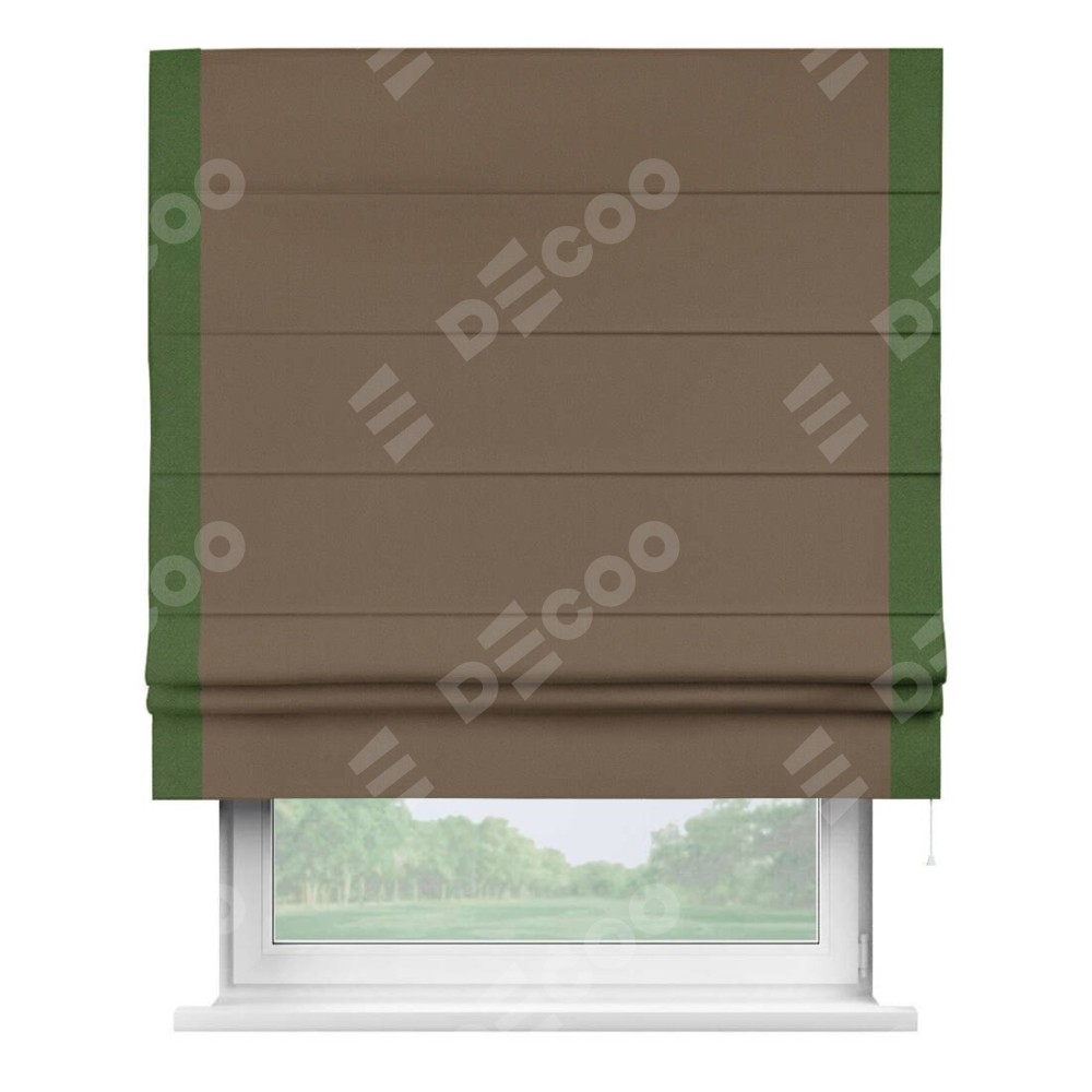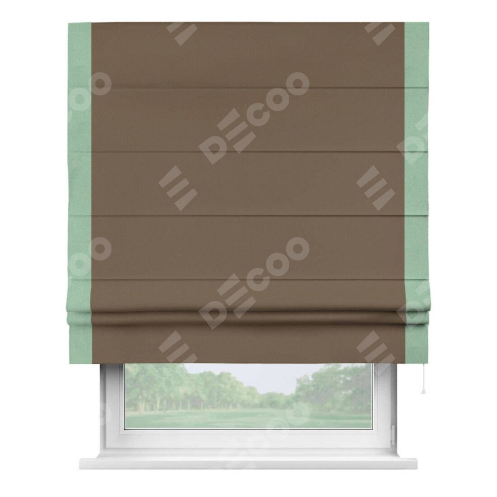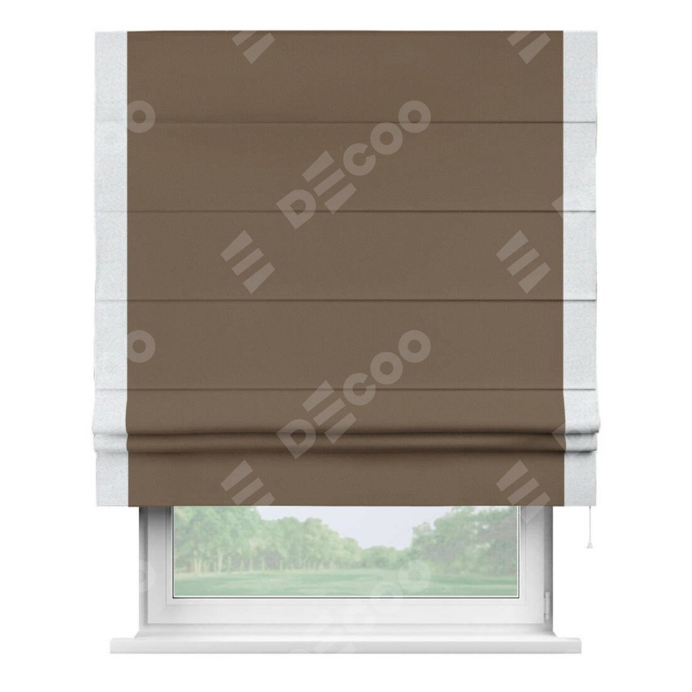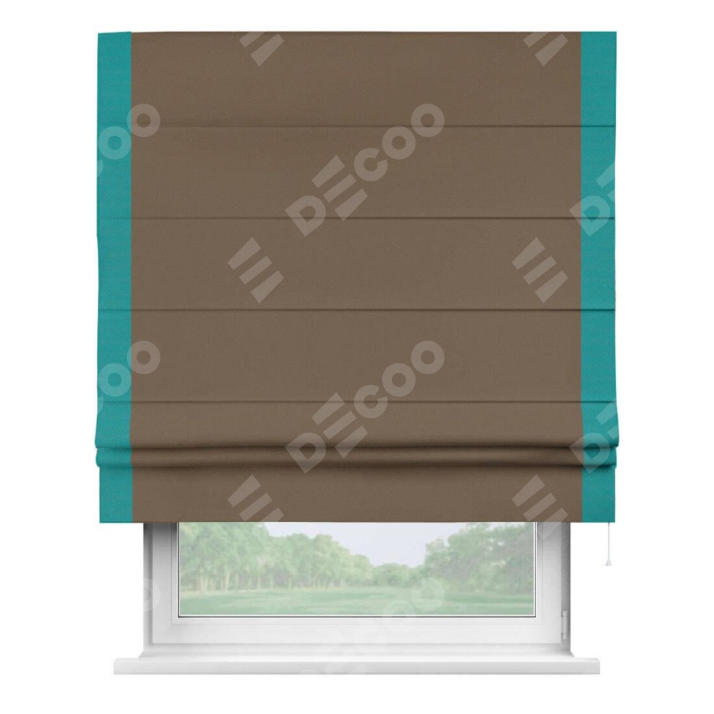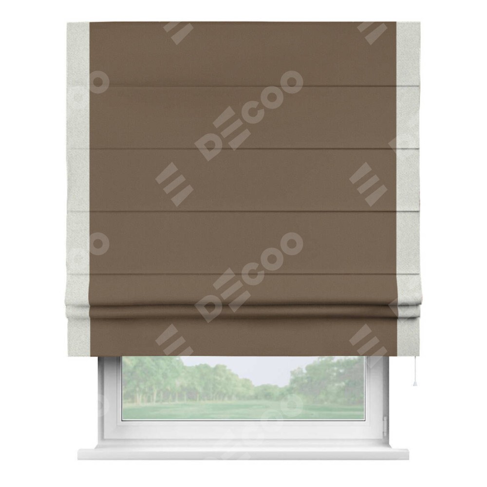 Римская штора производителя «Cortin», используется для проёма, пошита из ткани блэкаут однотонный коричневый, артикул ткани 91334. Отделка шторы кантом «Стрим Дуо», ткань для канта используется из блэкаута однотонного разной расцветки на выбор. Имеет универсальный механизм и подходит для монтажа: на потолок, на стену и в нишу.