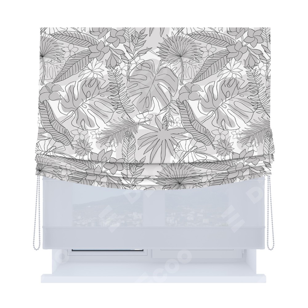 Римская штора день-ночь производителя «Cortin», используется для проёма, пошита из двух полотен, с лицевой блэкаут с нанесением сублимационной печати «Тропический лес», вторая ткань тюль (по стандарту комплектуется тюль белого цвета артикул V-01). Имеет универсальный механизм и подходит для монтажа: на потолок, на стену и в нишу. Удобное управление каждой шторой отдельно.