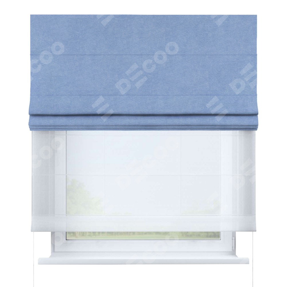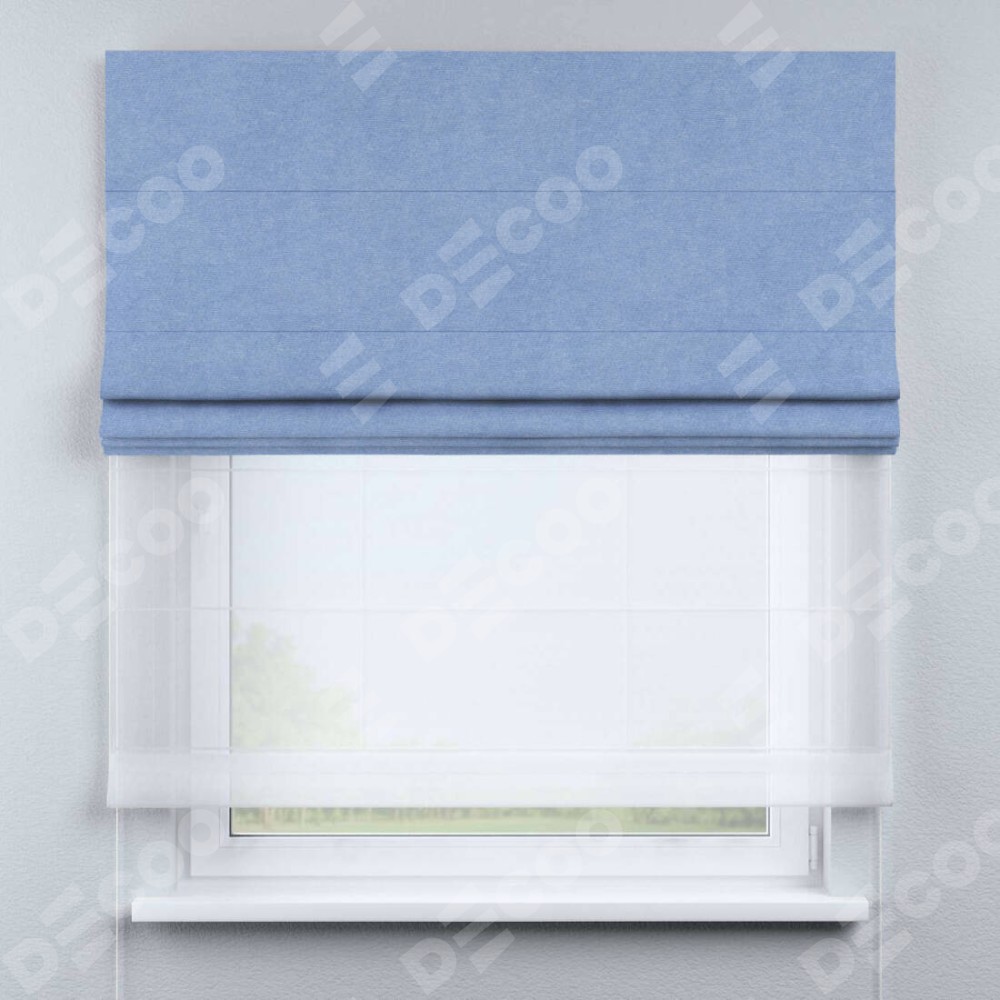 Двойная римская штора «День-ночь» от производителя Cortin предназначена для использования в проёмах. Эта штора уникальна тем, что состоит из двух полотен. На лицевой стороне находится вельвет васильковый (артикул: 33799), обеспечивающий мягкое затемнение. В комплект также входит вторая ткань — легкий белый тюль (артикул: V-01), который добавляет изящества и легкости оформлению окна. Кроме того, доступны и другие разновидности ткани тюль, выбор которых доступен по ссылке .