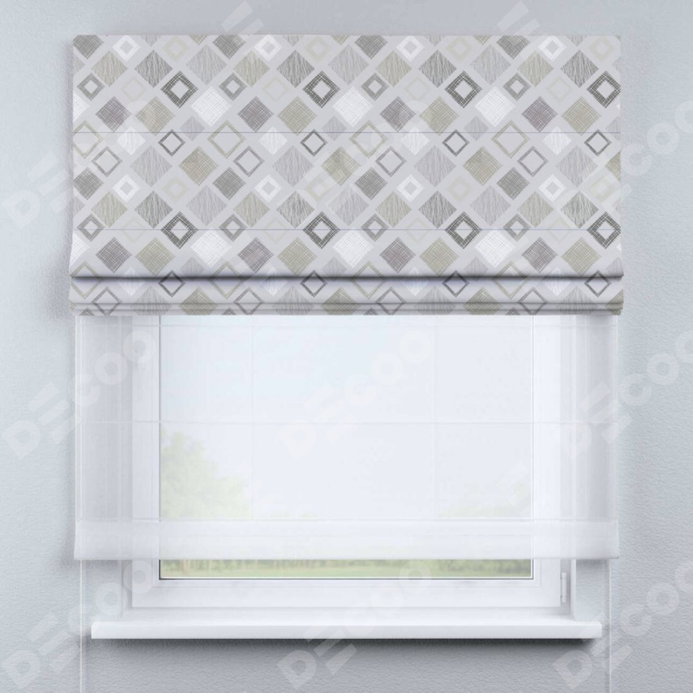 Двойная римская штора «День-ночь» от производителя Cortin предназначена для использования в проёмах. Эта штора уникальна тем, что состоит из двух полотен. На лицевой стороне находится блэкаут с нанесением сублимационной печати «Квадро», обеспечивающий эффективное затемнение. В комплект также входит вторая ткань — легкий белый тюль (артикул: V-01), который добавляет изящества и легкости оформлению окна. Кроме того, доступны и другие разновидности ткани тюль, выбор которых доступен по ссылке .
