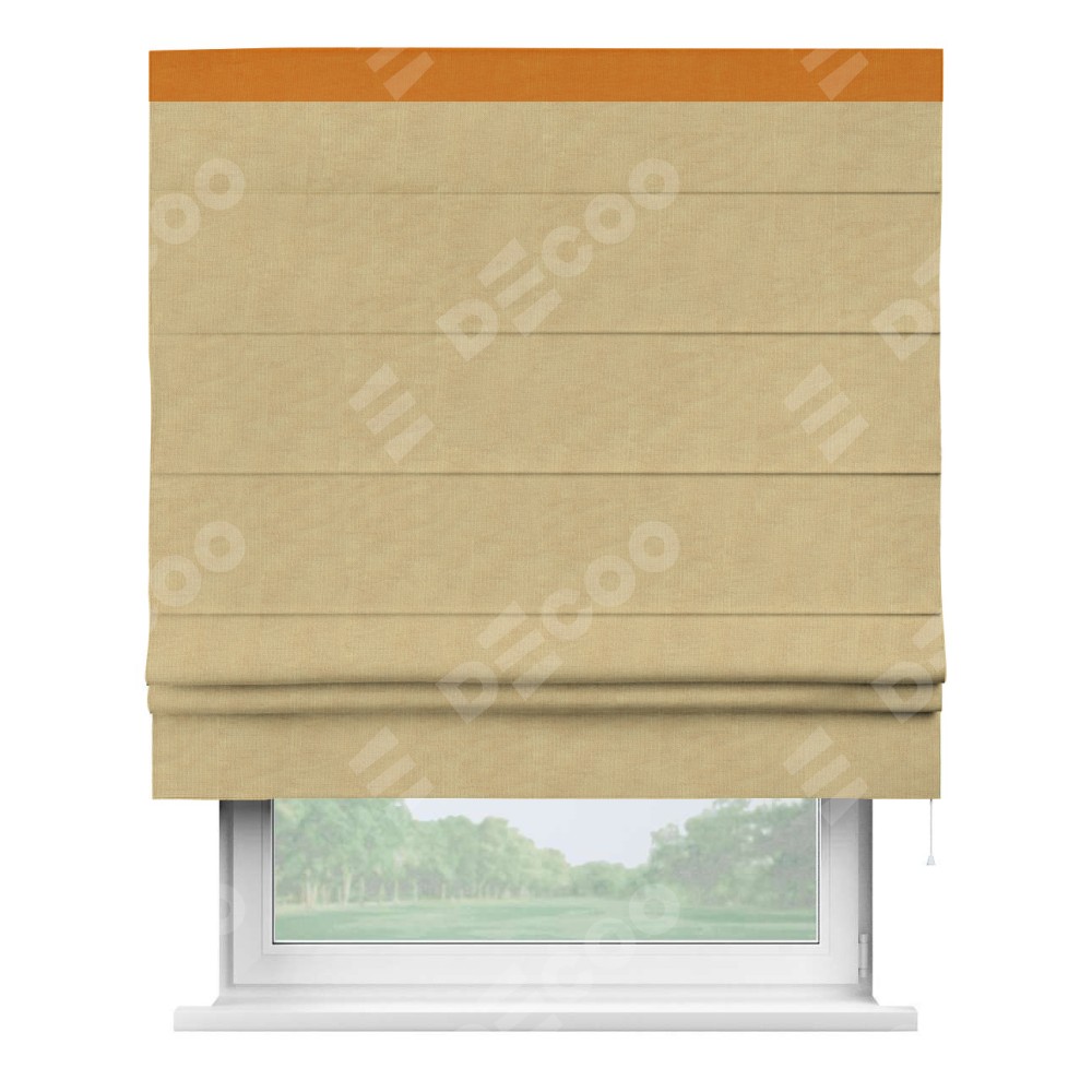 Римская штора производителя «Cortin», используется для проёма, пошита из ткани канвас абрикосовый, артикул ткани v-448. Отделка шторы кантом «Кинг» (оранжевый v-106), ткань для канта используется из канваса разной расцветки на выбор. Имеет универсальный механизм и подходит для монтажа: на потолок, на стену и в нишу.