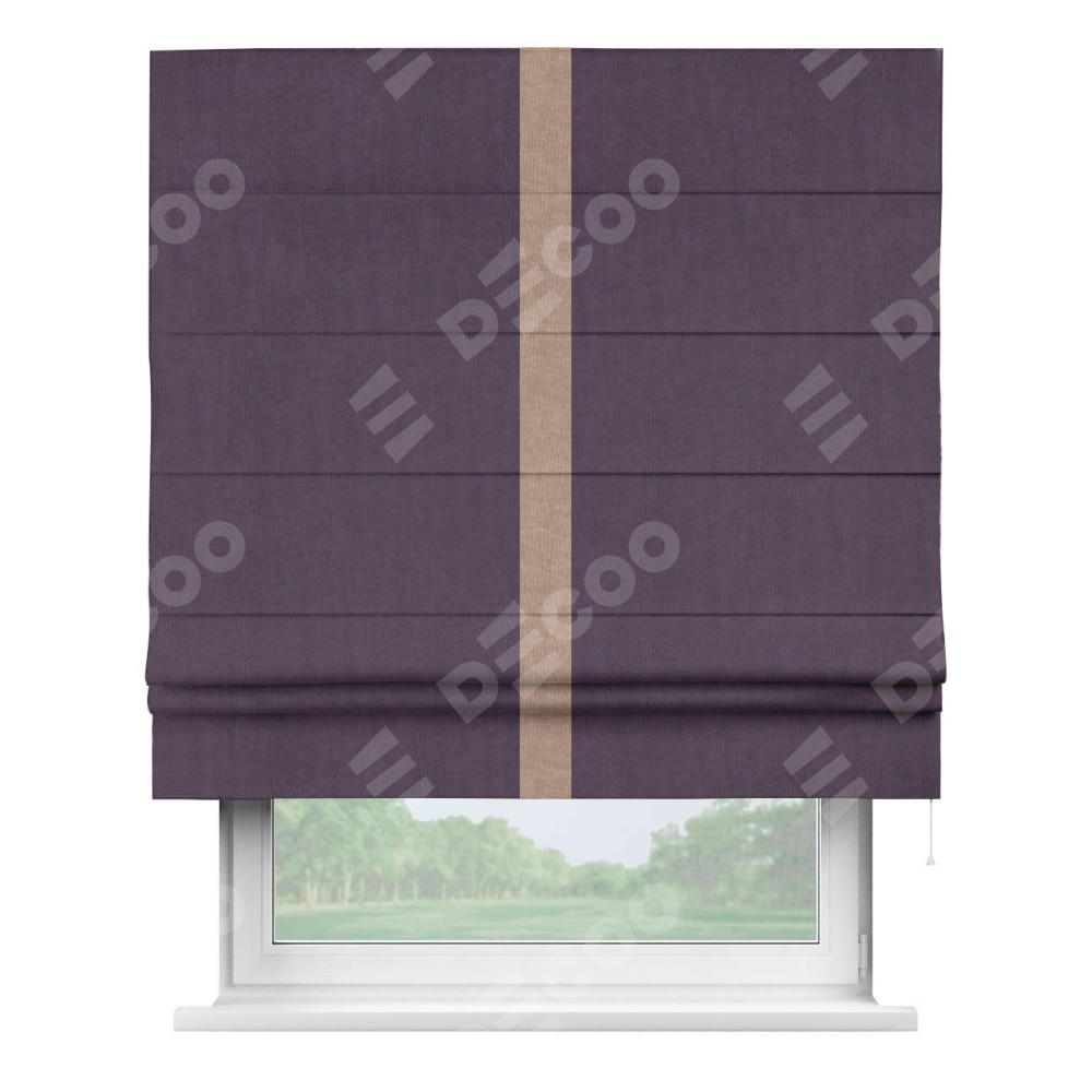 Римская штора производителя «Cortin», используется для проёма, пошита из ткани канвас баклажановый, артикул ткани v-111. Отделка шторы кантом «Хайвей» (розовая пудра v-34), ткань для канта используется из канваса разной расцветки на выбор. Имеет универсальный механизм и подходит для монтажа: на потолок, на стену и в нишу.