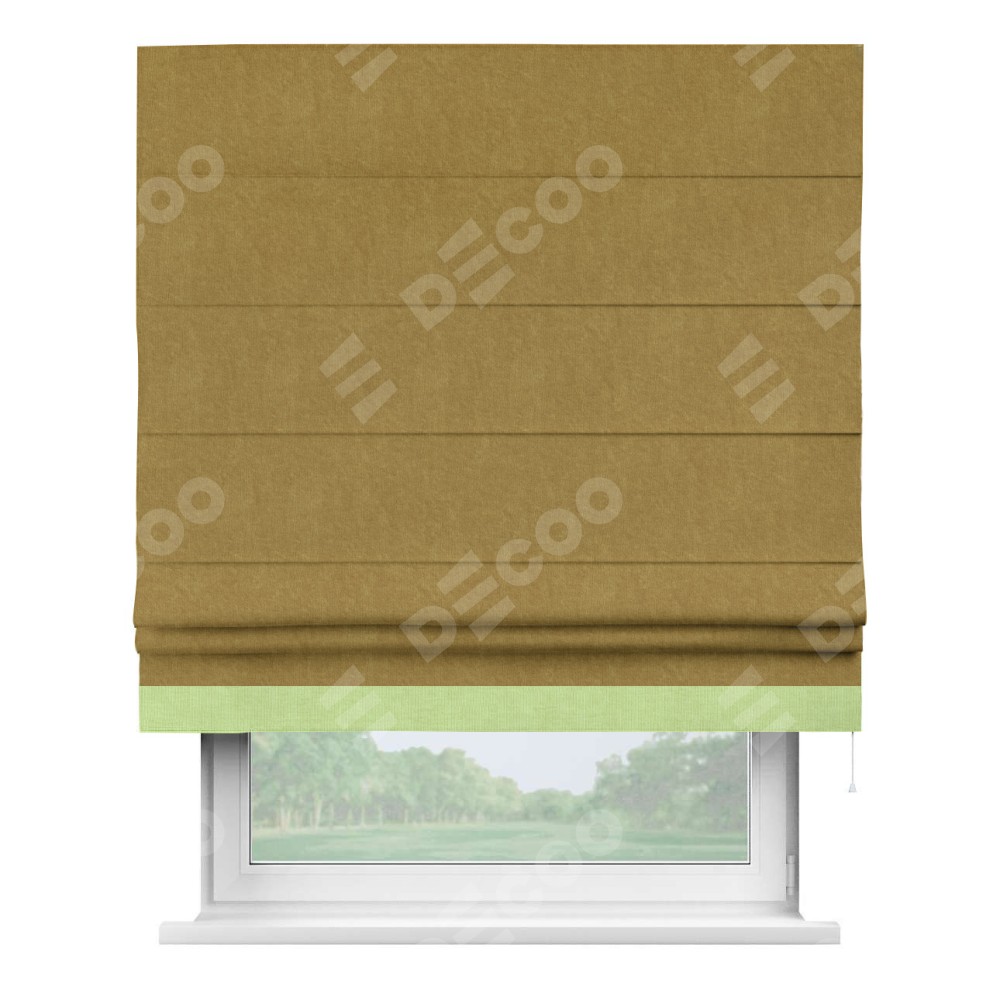 Римская штора производителя «Cortin», используется для проёма, пошита из ткани канвас горчица, артикул ткани v-476. Отделка шторы кантом «Джестер» (липовый v-207), ткань для канта используется из канваса разной расцветки на выбор. Имеет универсальный механизм и подходит для монтажа: на потолок, на стену и в нишу.
