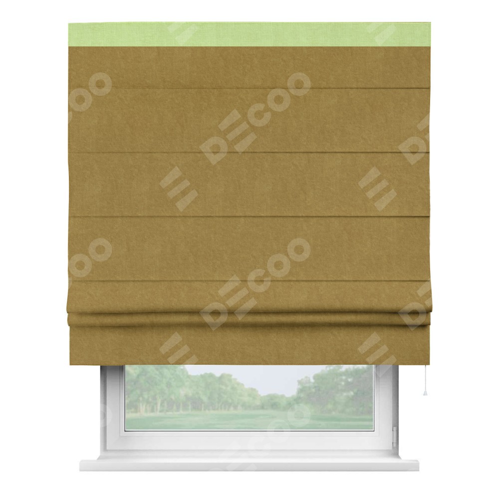 Римская штора производителя «Cortin», используется для проёма, пошита из ткани канвас горчица, артикул ткани v-476. Отделка шторы кантом «Кинг» (липовый v-207), ткань для канта используется из канваса разной расцветки на выбор. Имеет универсальный механизм и подходит для монтажа: на потолок, на стену и в нишу.