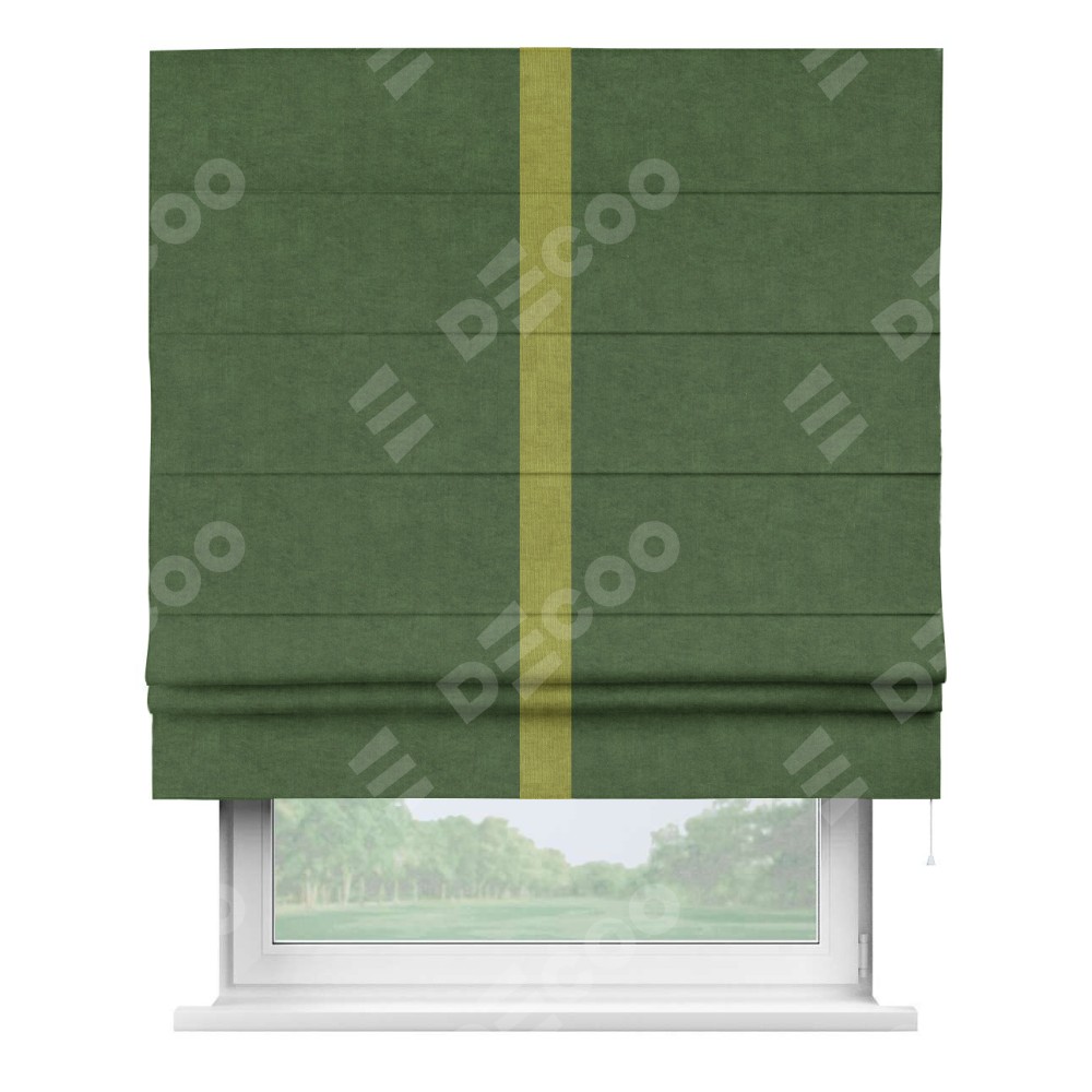 Римская штора производителя «Cortin», используется для проёма, пошита из ткани канвас зелёный, артикул ткани v-16. Отделка шторы кантом «Хайвей» (зелёное яблоко v-370), ткань для канта используется из канваса разной расцветки на выбор. Имеет универсальный механизм и подходит для монтажа: на потолок, на стену и в нишу.