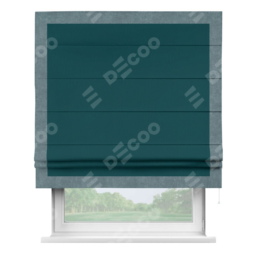 Римская штора производителя «Cortin», используется для проёма, пошита из ткани канвас изумрудный, артикул ткани v-12487. Отделка шторы кантом «Чесс» (серо-голубой v-330), ткань для канта используется из канваса разной расцветки на выбор. Имеет универсальный механизм и подходит для монтажа: на потолок, на стену и в нишу.