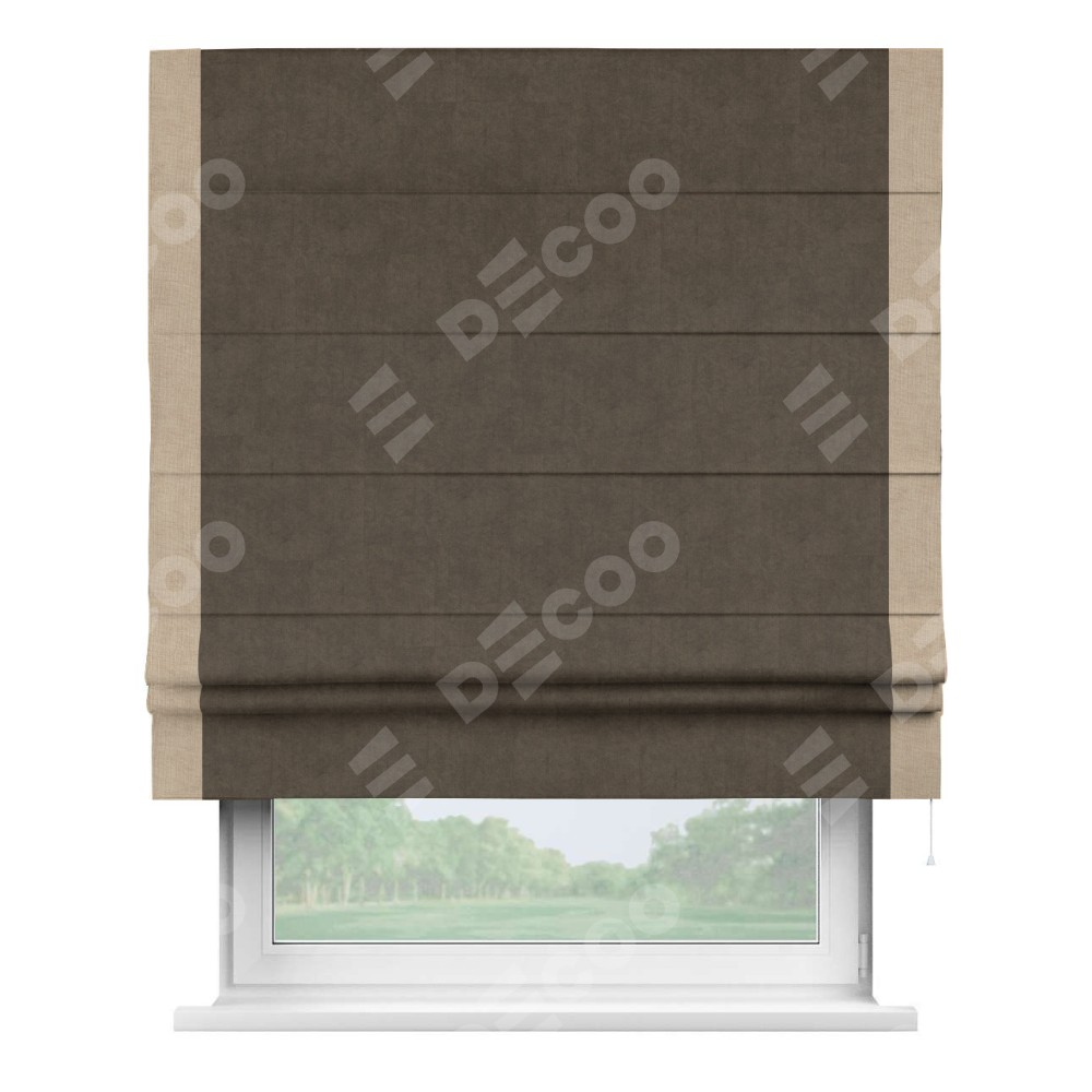 Римская штора производителя «Cortin», используется для проёма, пошита из ткани канвас коричневый, артикул ткани v-29. Отделка шторы кантом «Стрим Дуо» (пудровый v-35), ткань для канта используется из канваса разной расцветки на выбор. Имеет универсальный механизм и подходит для монтажа: на потолок, на стену и в нишу.