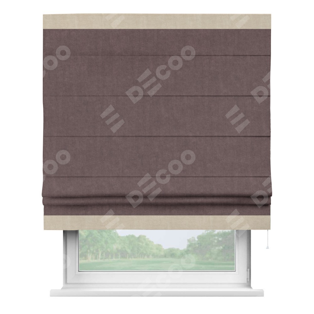 Римская штора производителя «Cortin», используется для проёма, пошита из ткани канвас махагон, артикул ткани v-37. Отделка шторы кантом «Горизонт» (шоколадный v-193), ткань для канта используется из канваса разной расцветки на выбор. Имеет универсальный механизм и подходит для монтажа: на потолок, на стену и в нишу.