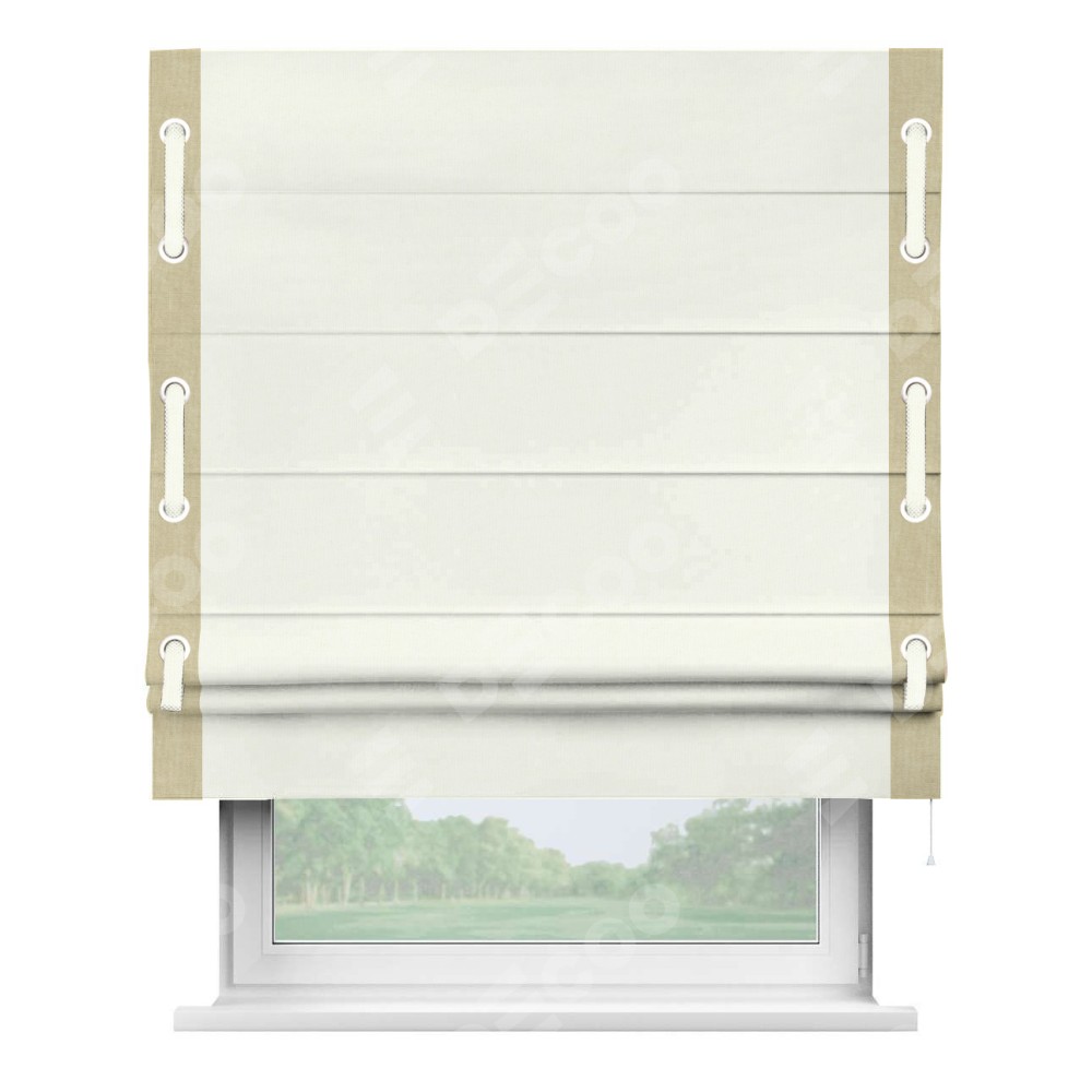 Римская штора производителя «Cortin», используется для проёма, пошита из ткани канвас молочный, артикул ткани v-93. Отделка шторы кантом «Стрим Дуо» (тёмно-бежевый v-196) на кантах расположены люверсы с пояском, ткань для канта используется из канваса разной расцветки на выбор. Ткань для пояска обычно используется из основной ткани шторы, а так же можно сделать из любой расцветки по желанию. Имеет универсальный механизм и подходит для монтажа: на потолок, на стену и в нишу.