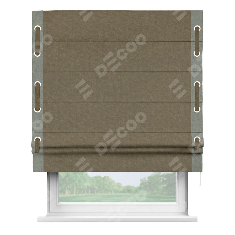 Римская штора производителя «Cortin», используется для проёма, пошита из ткани канвас молочный шоколад, артикул ткани v-08. Отделка шторы кантом «Стрим Дуо» (сизый v-1902) на кантах расположены люверсы с пояском, ткань для канта используется из канваса разной расцветки на выбор. Ткань для пояска обычно используется из основной ткани шторы, а так же можно сделать из любой расцветки по желанию. Имеет универсальный механизм и подходит для монтажа: на потолок, на стену и в нишу.