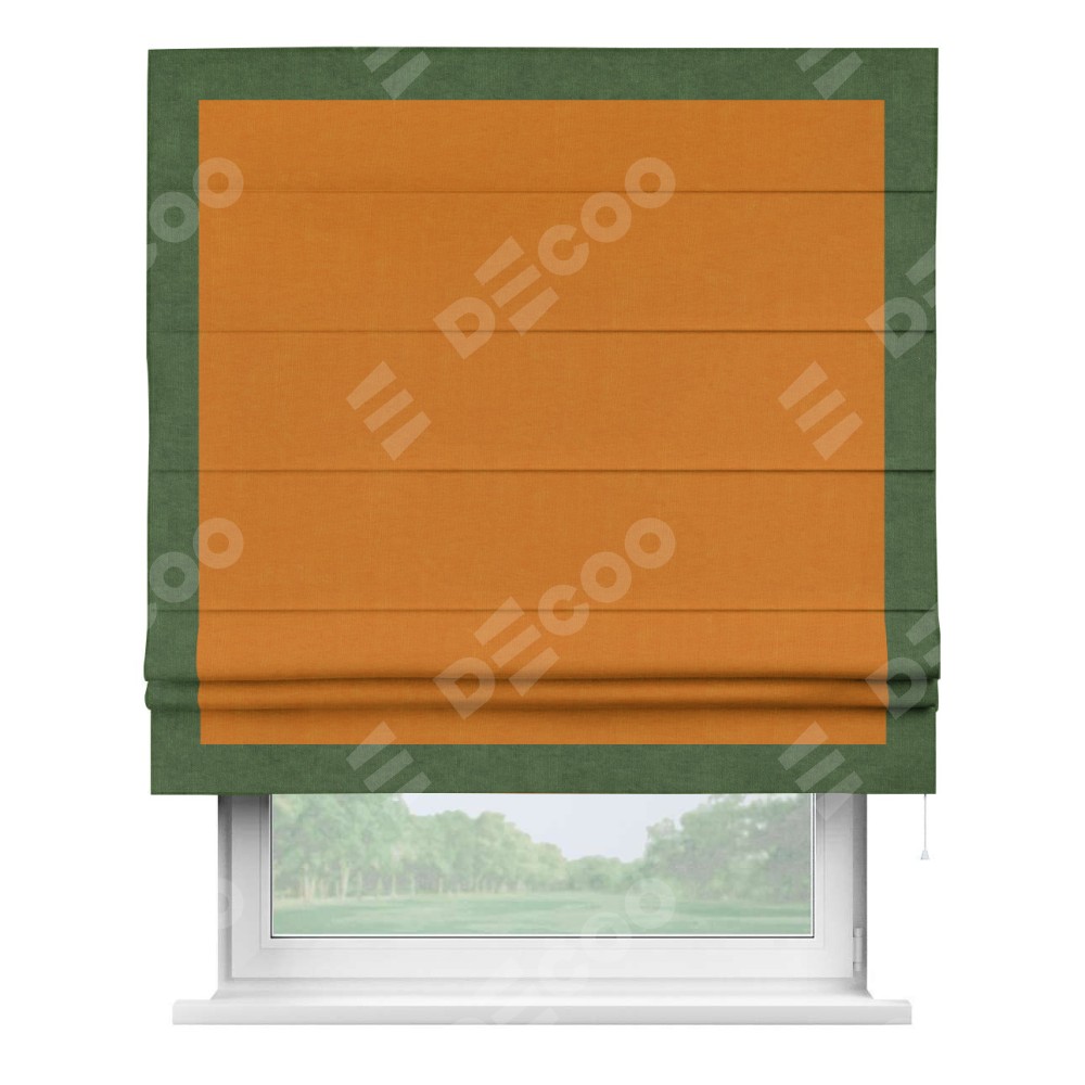 Римская штора производителя «Cortin», используется для проёма, пошита из ткани канвас оранжевый, артикул ткани v-106. Отделка шторы кантом «Чесс» (зелёный v-16), ткань для канта используется из канваса разной расцветки на выбор. Имеет универсальный механизм и подходит для монтажа: на потолок, на стену и в нишу.