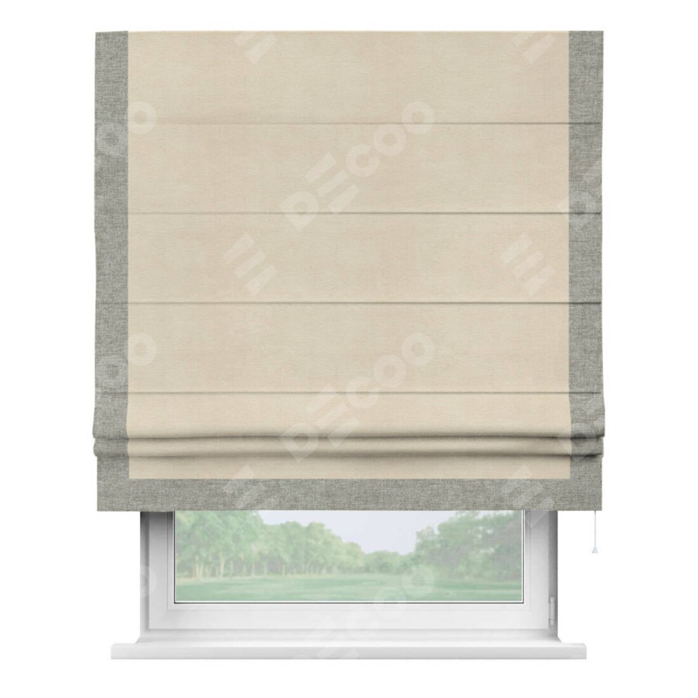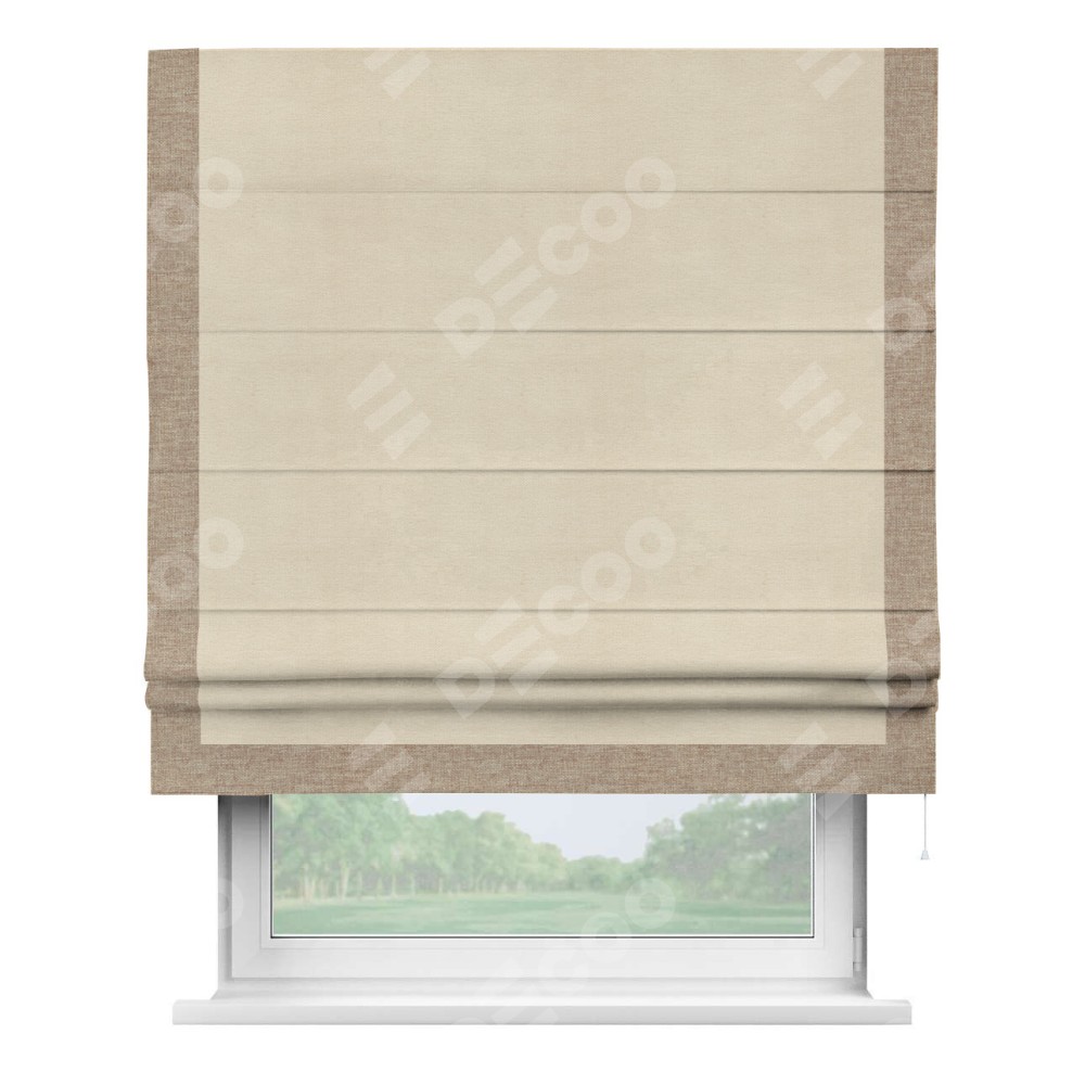 Римская штора производителя «Cortin», используется для проёма, пошита из ткани лён кашемир шампань, артикул 17205. Отделка шторы кантом «Виктория», ткань для канта используется из льна разной расцветки на выбор. Имеет универсальный механизм и подходит для монтажа: на потолок, на стену и в нишу.