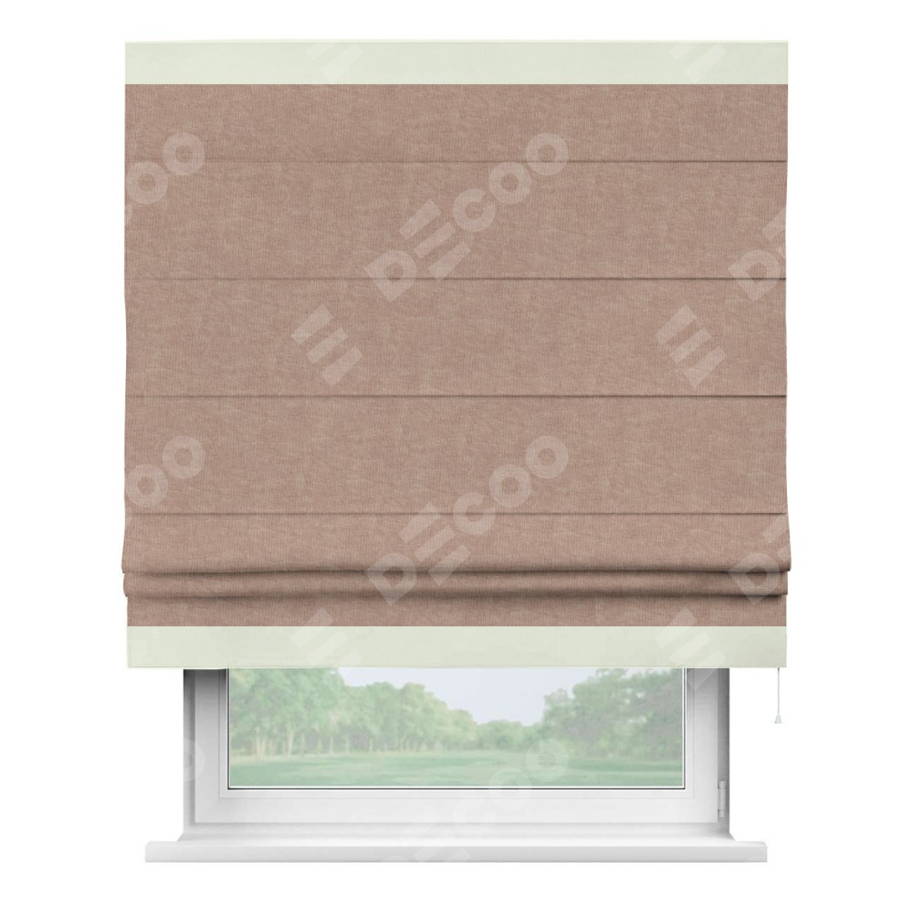 Римская штора производителя «Cortin», используется для проёма, пошита из ткани канвас розовая пудра, артикул ткани v-34. Отделка шторы кантом «Горизонт» (сливочный v-94), ткань для канта используется из канваса разной расцветки на выбор. Имеет универсальный механизм и подходит для монтажа: на потолок, на стену и в нишу.
