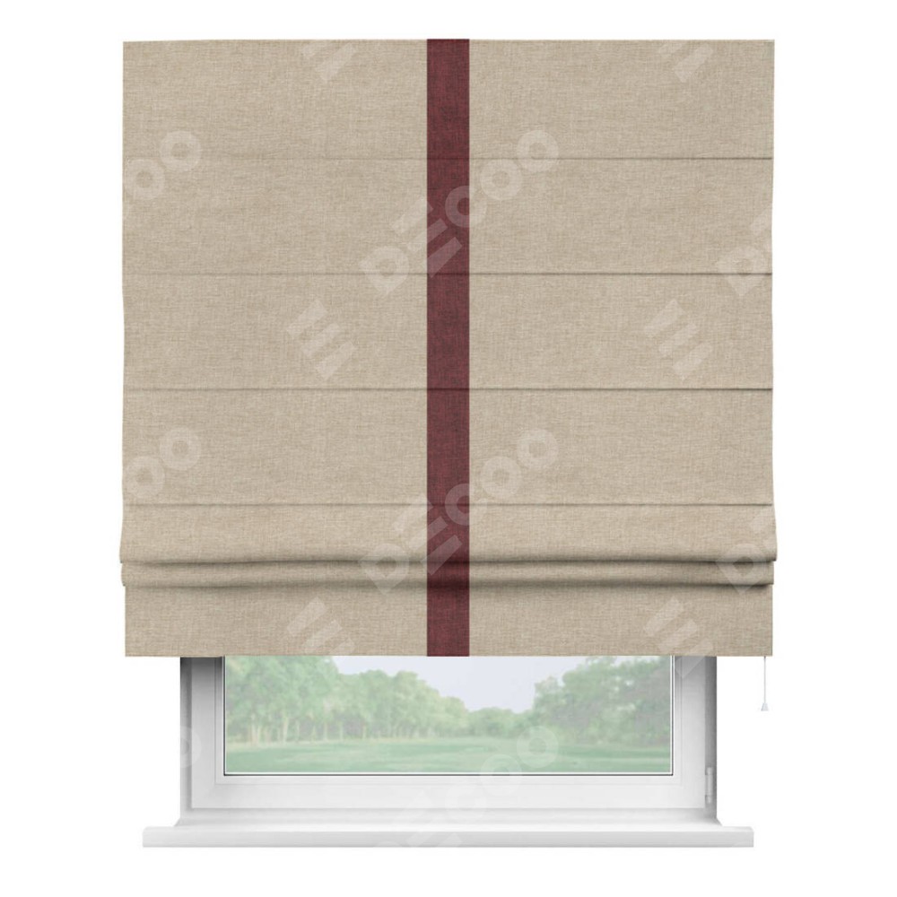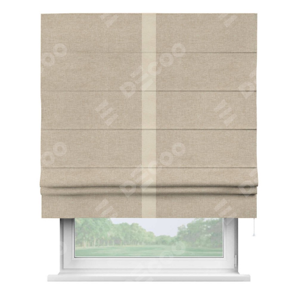Римская штора производителя «Cortin», используется для проёма, пошита из ткани лён кашемир бежевый, артикул 17206. Отделка шторы кантом «Хайвэй», ткань для канта используется из льна разной расцветки на выбор. Имеет универсальный механизм и подходит для монтажа: на потолок, на стену и в нишу.
