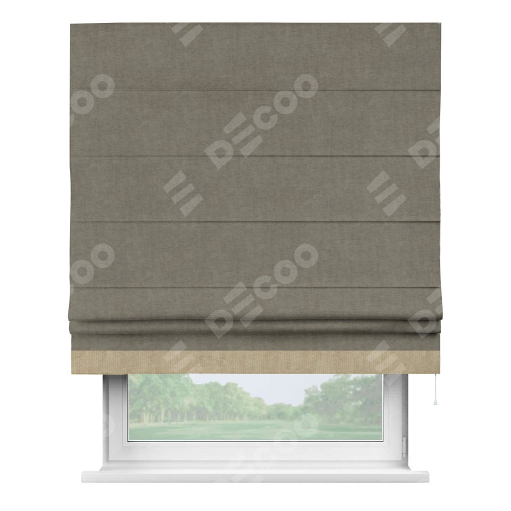 Римская штора производителя «Cortin», используется для проёма, пошита из ткани канвас серо-бежевый, артикул ткани v-224. Отделка шторы кантом «Джестер» (кофе с молоком v-07), ткань для канта используется из канваса разной расцветки на выбор. Имеет универсальный механизм и подходит для монтажа: на потолок, на стену и в нишу.