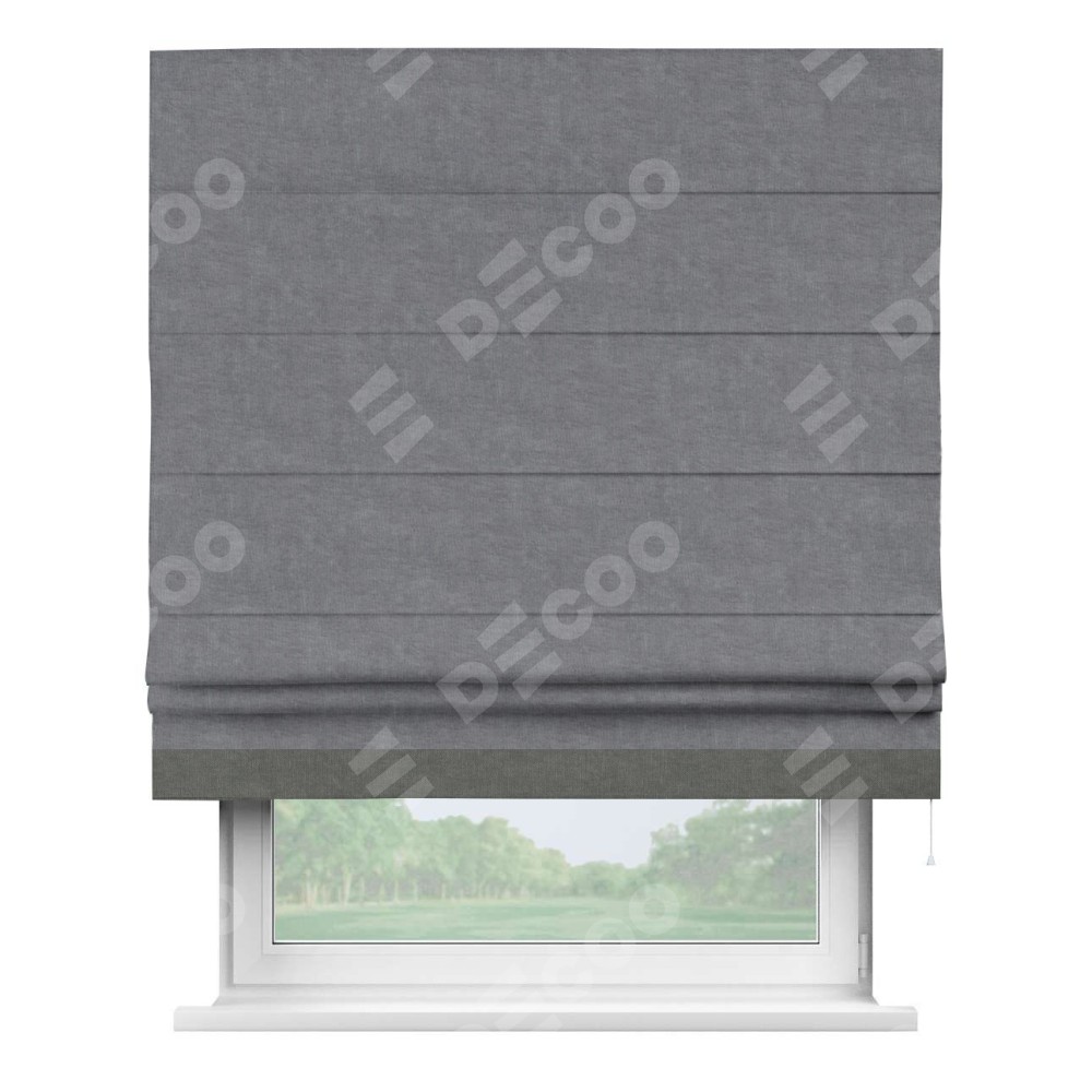 Римская штора производителя «Cortin», используется для проёма, пошита из ткани канвас стальной, артикул ткани v-1082. Отделка шторы кантом «Джестер» (тёмно-серый v-340), ткань для канта используется из канваса разной расцветки на выбор. Имеет универсальный механизм и подходит для монтажа: на потолок, на стену и в нишу.