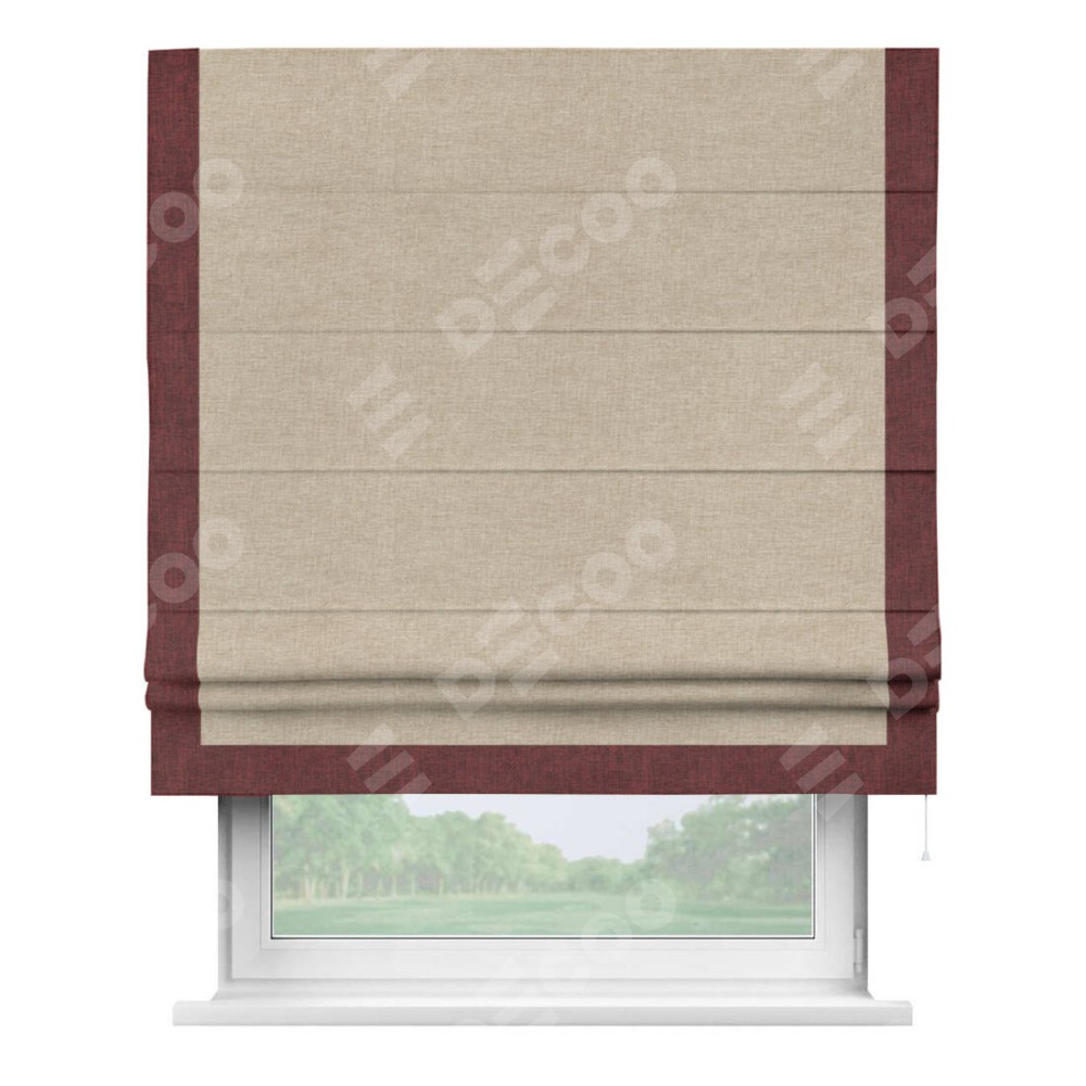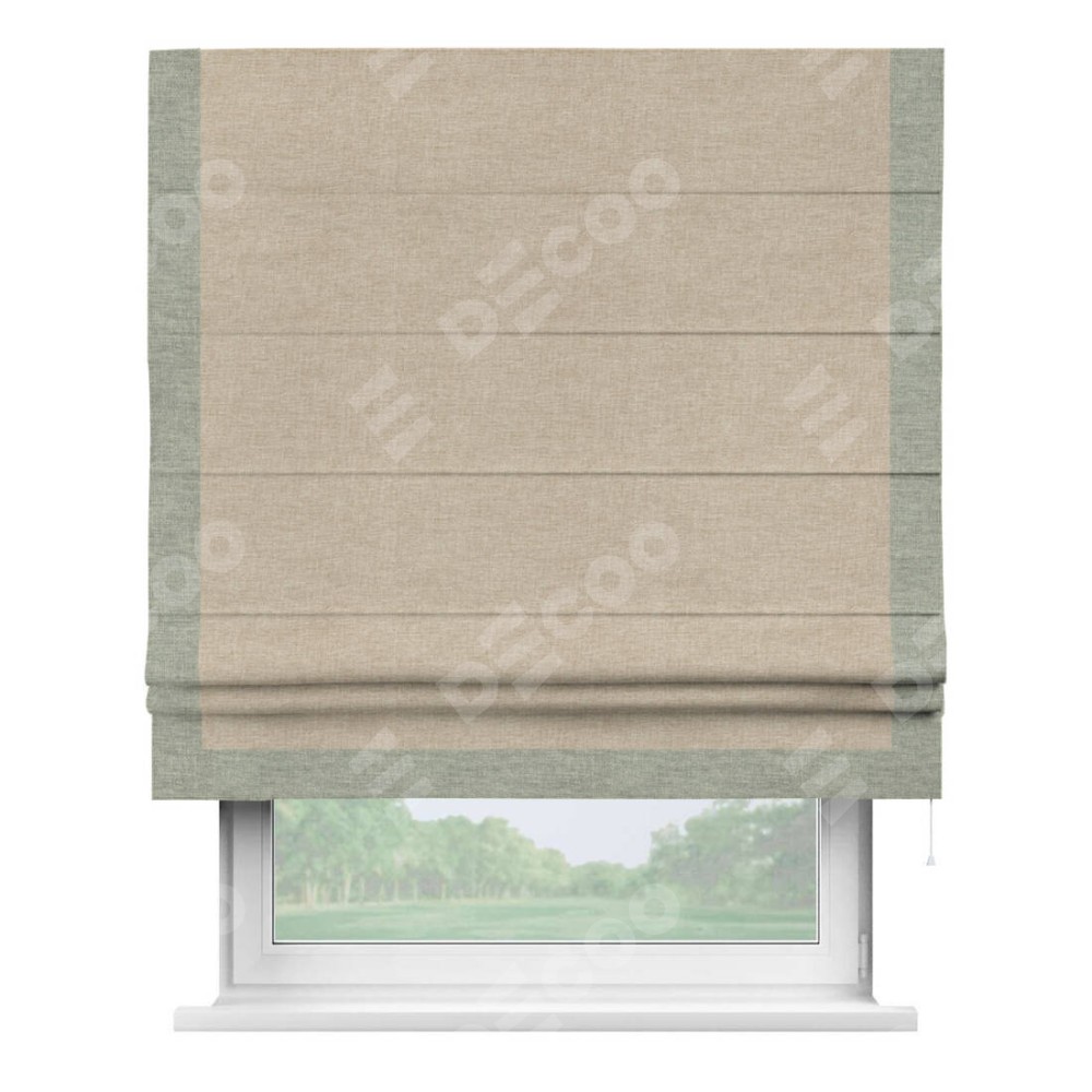 Римская штора производителя «Cortin», используется для проёма, пошита из ткани лён кашемир бежевый, артикул 17206. Отделка шторы кантом «Виктория», ткань для канта используется из льна разной расцветки на выбор. Имеет универсальный механизм и подходит для монтажа: на потолок, на стену и в нишу.