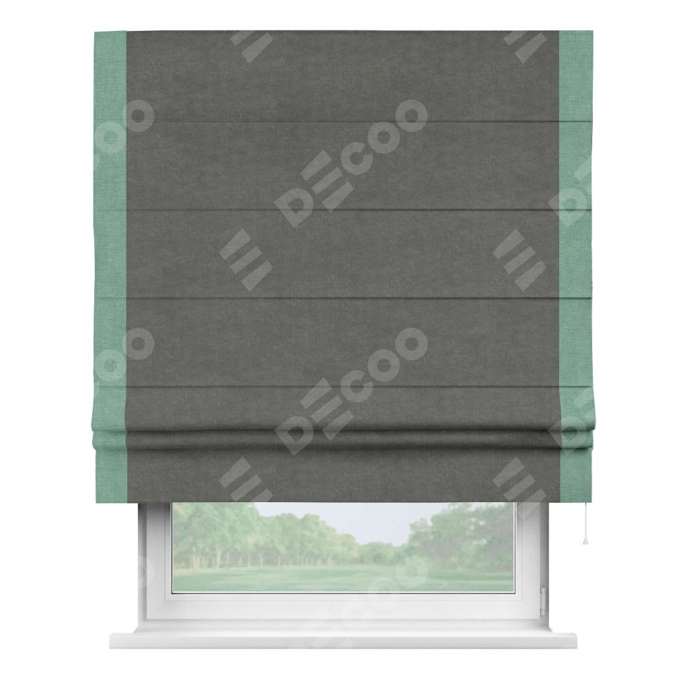 Римская штора производителя «Cortin», используется для проёма, пошита из ткани канвас тёмно-серый, артикул ткани v-340. Отделка шторы кантом «Стрим Дуо» (мятный v-248), ткань для канта используется из канваса разной расцветки на выбор. Имеет универсальный механизм и подходит для монтажа: на потолок, на стену и в нишу.