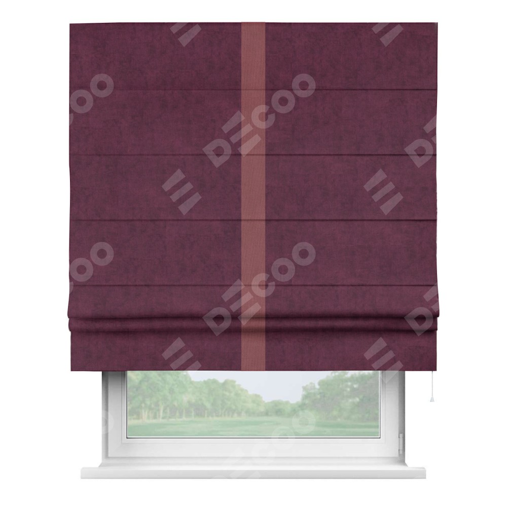 Римская штора производителя «Cortin», используется для проёма, пошита из ткани канвас фиолетовый, артикул ткани v-99. Отделка шторы кантом «Хайвей» (ягодный v-28), ткань для канта используется из канваса разной расцветки на выбор. Имеет универсальный механизм и подходит для монтажа: на потолок, на стену и в нишу.