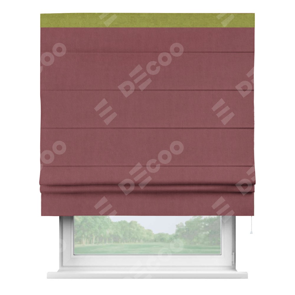 Римская штора производителя «Cortin», используется для проёма, пошита из ткани канвас ягодный, артикул ткани v-28. Отделка шторы кантом «Кинг» (зелёное яблоко v-370), ткань для канта используется из канваса разной расцветки на выбор. Имеет универсальный механизм и подходит для монтажа: на потолок, на стену и в нишу.