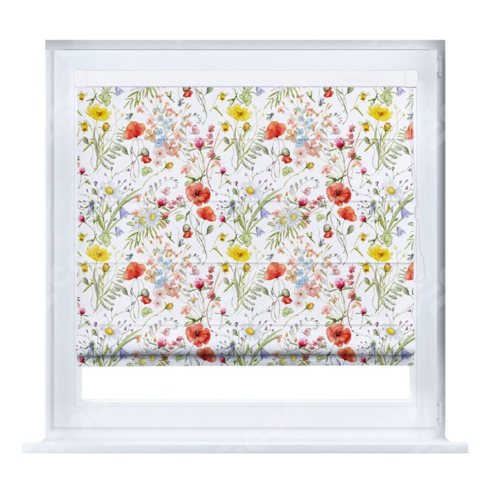 Римская штора производителя «Cortin», устанавливается на створку окна, пошита из ткани блэкаут с нанесением сублимационной печати «Полевые маки». Штора шьётся по индивидуальным размерам, для данного типа римской шторы возможная ширина от 35 до 150 см., высота до 250 см.