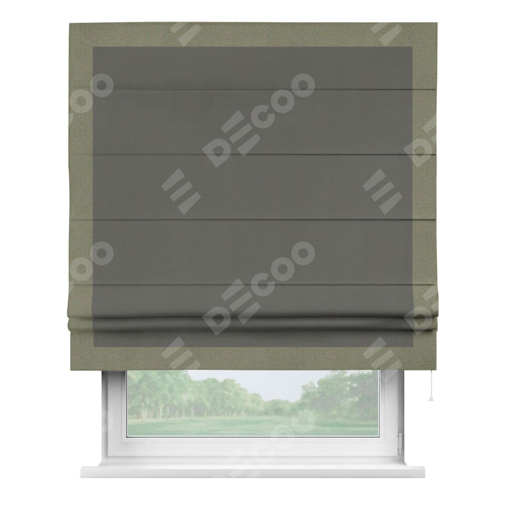 Римская штора производителя «Cortin», используется для проёма, пошита из ткани блэкаут однотонный тёмно-серый, артикул ткани 91570. Отделка шторы кантом «Чесс», ткань для канта используется из блэкаута однотонного разной расцветки на выбор. Имеет универсальный механизм и подходит для монтажа: на потолок, на стену и в нишу.