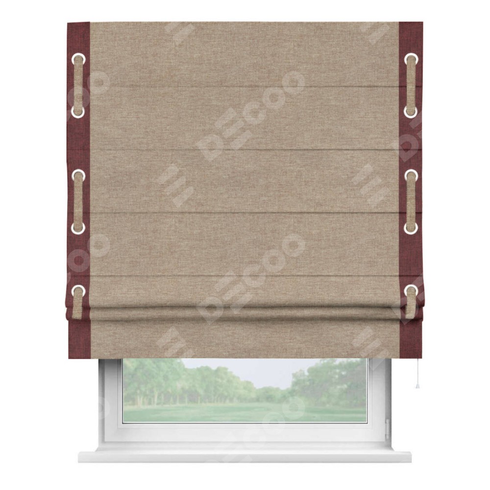 Римская штора производителя «Cortin», используется для проёма, пошита из ткани лён кашемир коричневый, артикул 21614. Отделка шторы кантом «Стрим Дуо» на кантах расположены люверсы с пояском, ткань для канта используется из льна разной расцветки на выбор. Ткань для пояска обычно используется из основной ткани шторы, а так же можно сделать из любой расцветки по желанию. Имеет универсальный механизм и подходит для монтажа: на потолок, на стену и в нишу.