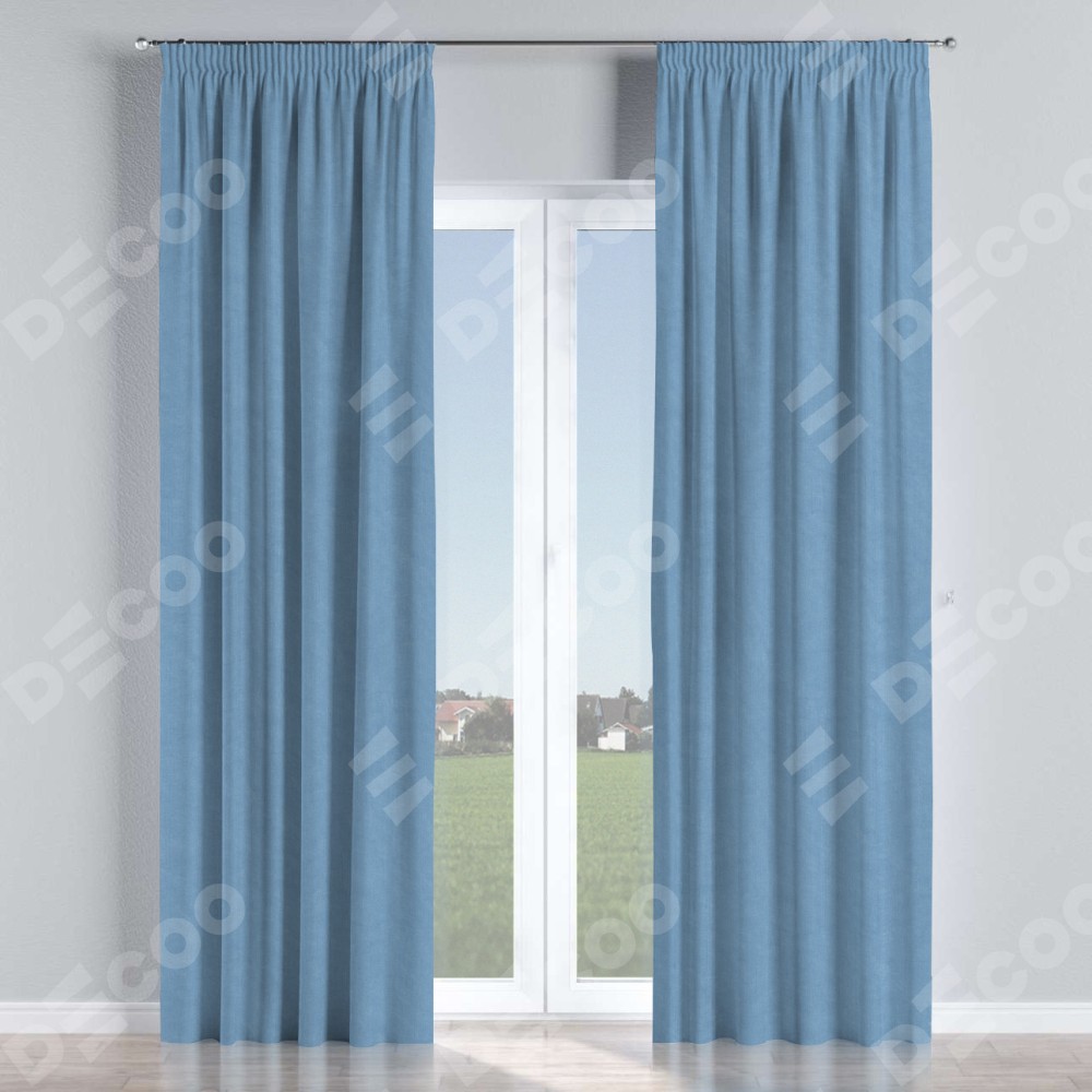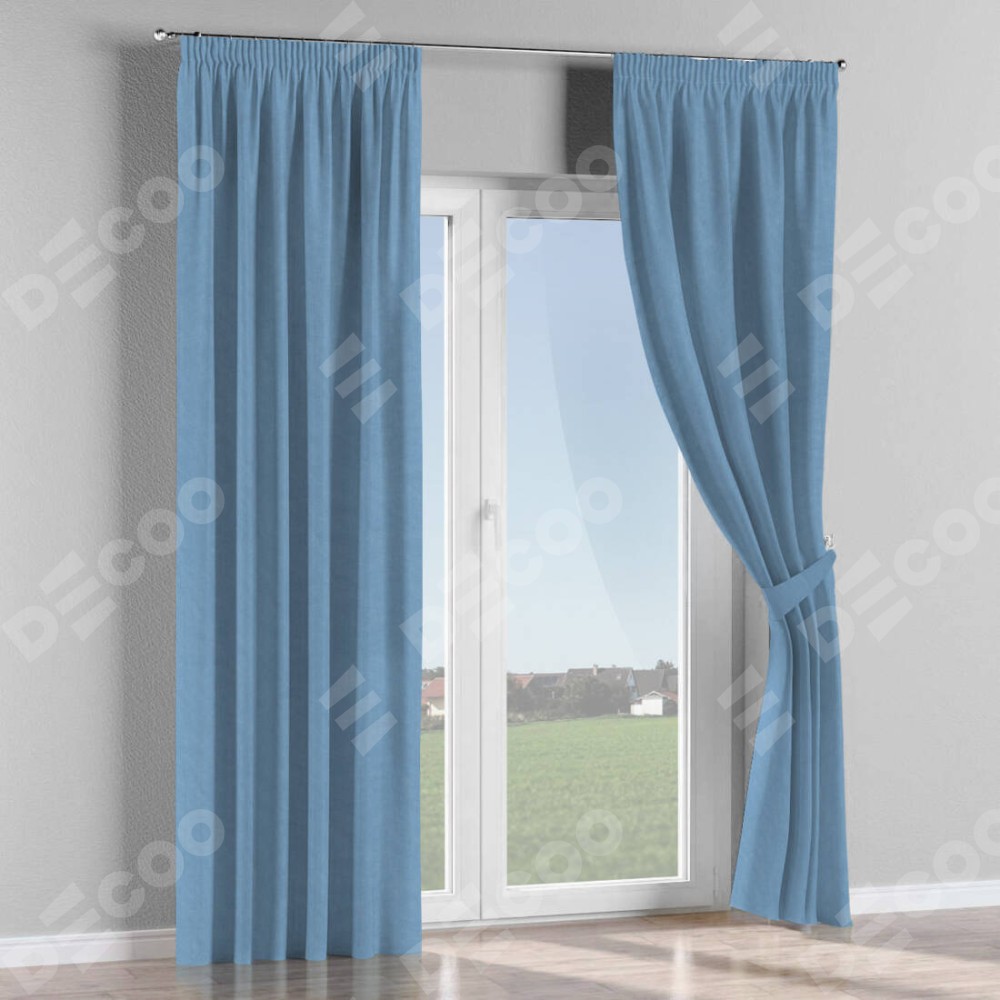 Комплект прямых штор, от производителя «Cortin», пошиты из ткани канвас голубой, артикул ткани 92729. С изнаночной стороны в верхней части штор пристрачивается шторная лента с декоративными складками «Карандаш». Для создания элегантных складок прямые шторы шьются по стандарту с коэффициентом 1:2 (на 100 см. ширины проёма 200 см. ширины ткани).