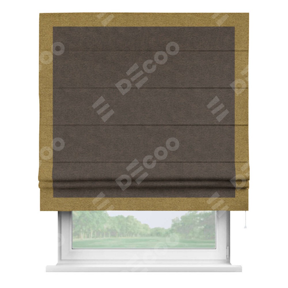 Римская штора производителя «Cortin», используется для проёма, пошита из ткани твид блэкаут тёмно-коричневый, артикул 90933. Отделка шторы кантом «Чесс», ткань для канта используется из твида разной расцветки на выбор. Имеет универсальный механизм и подходит для монтажа: на потолок, на стену и в нишу.