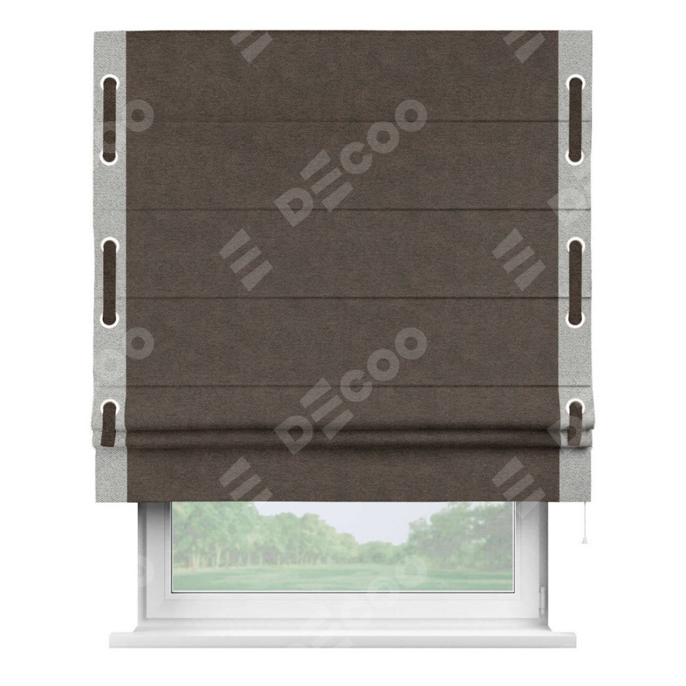 Римская штора производителя «Cortin», используется для проёма, пошита из ткани твид блэкаут тёмно-коричневый, артикул 90933. Отделка шторы кантом «Стрим Дуо» на кантах расположены люверсы с пояском, ткань для канта используется из твида разной расцветки на выбор. Ткань для пояска обычно используется из основной ткани шторы, а так же можно сделать из любой расцветки по желанию. Имеет универсальный механизм и подходит для монтажа: на потолок, на стену и в нишу.
