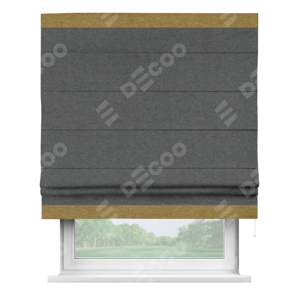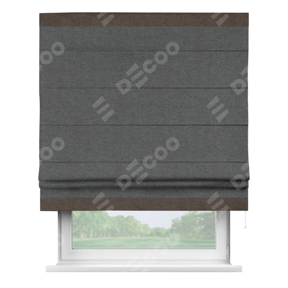 Римская штора производителя «Cortin», используется для проёма, пошита из ткани твид блэкаут тёмно-серый, артикул 90938. Отделка шторы кантом «Горизонт», ткань для канта используется из твида разной расцветки на выбор. Имеет универсальный механизм и подходит для монтажа: на потолок, на стену и в нишу.