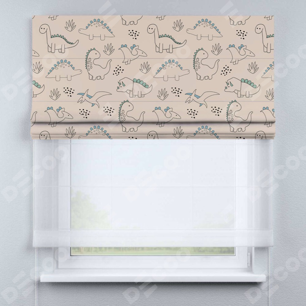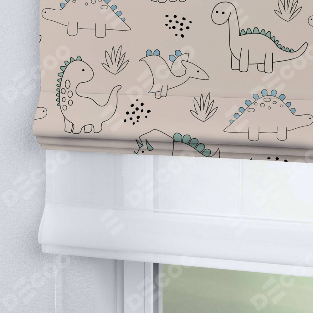 Двойная римская штора «День-ночь» от производителя Cortin предназначена для использования в проёмах. Эта штора уникальна тем, что состоит из двух полотен. На лицевой стороне находится блэкаут с нанесением сублимационной печати «Динозаврики», обеспечивающий эффективное затемнение. В комплект также входит вторая ткань — легкий белый тюль (артикул: V-01), который добавляет изящества и легкости оформлению окна. Кроме того, доступны и другие разновидности ткани тюль, выбор которых доступен по  ссылке .