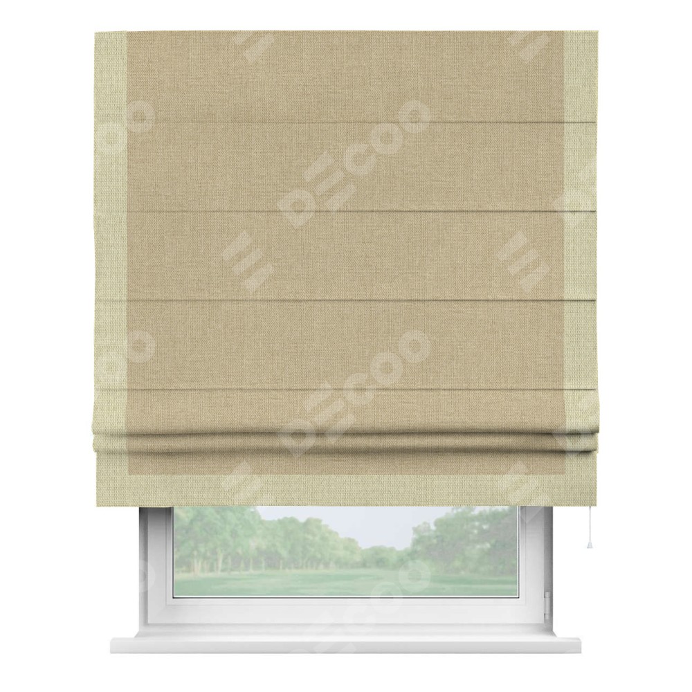 Римская штора с отделкой кантом «Виктория», пошита из ткани лён димаут песочный, артикул: 16256. представляет собой элегантное решение для оконного оформления. Кант по бокам и снизу шторы добавляет изысканности и аккуратности внешнему виду, подчеркивая линии и форму шторы. Этот элемент декора не только украшает, но и выполняет практическую функцию, защищая края ткани от износа. Кант может быть выполнен в контрастном или гармонирующем цвете, что позволяет добиться различных стилевых эффектов и легко вписать штору в интерьер комнаты.