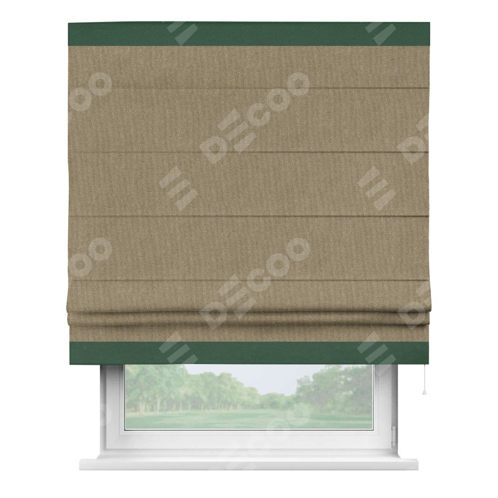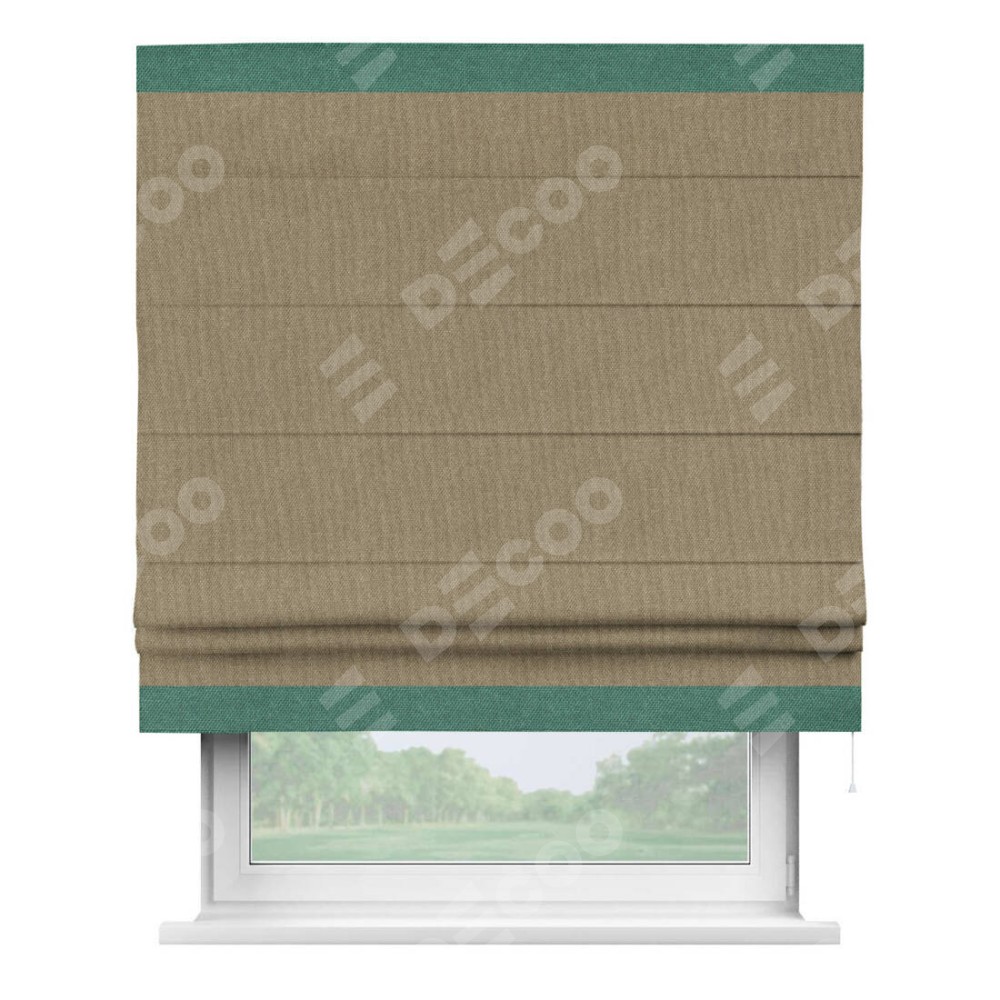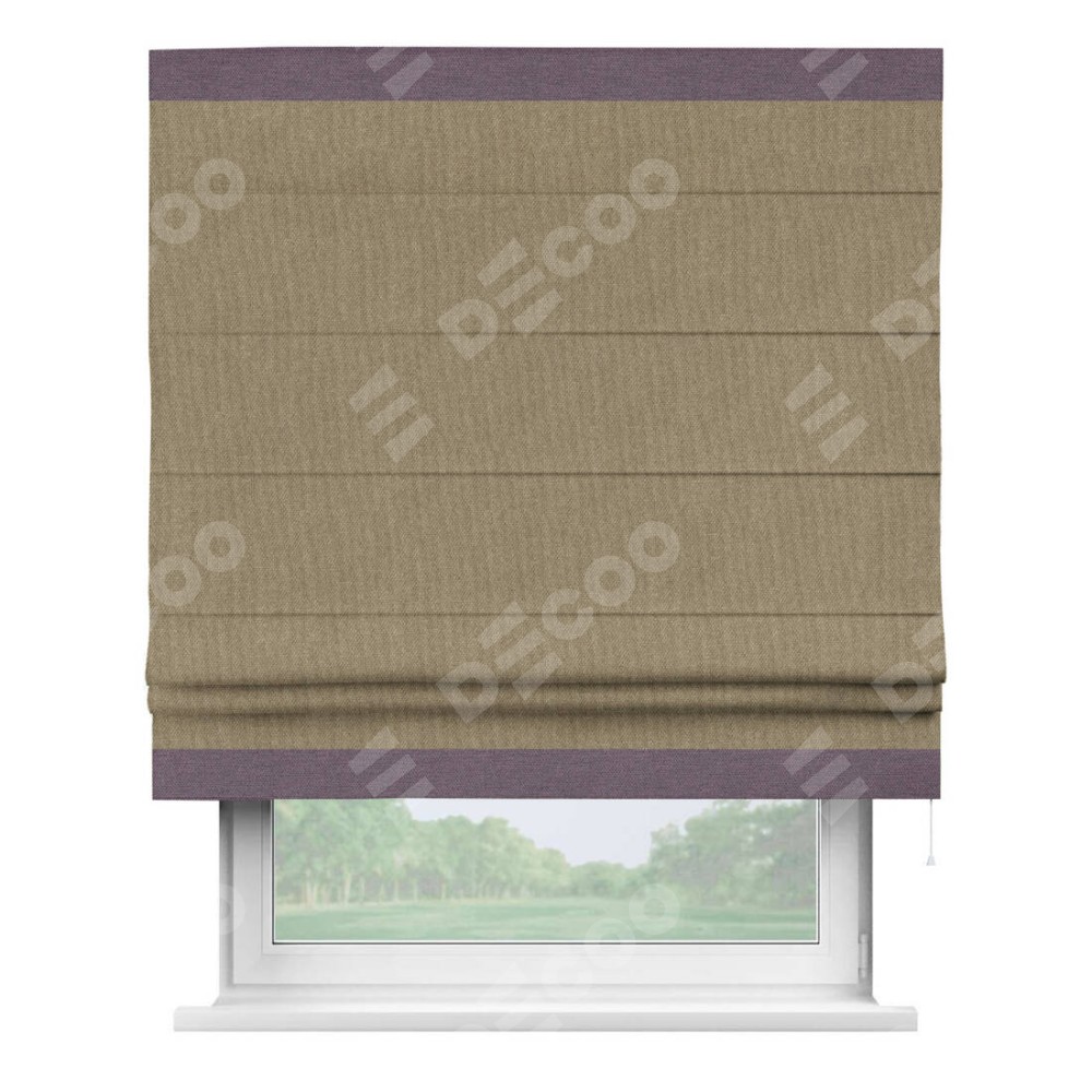 Римская штора пошита из ткани лён димаут тёмно-бежевый, артикул: 16261, с отделкой кантом «Горизонт» предлагает уникальное дизайнерское решение, при котором кант располагается только вверху и снизу шторы. Такое решение делает акцент на горизонтальных линиях, визуально расширяя пространство и придавая окну более строгий и организованный вид. Отделка кантом в этих ключевых местах не только украшает штору, но и способствует её долговечности, защищая наиболее уязвимые к износу края.