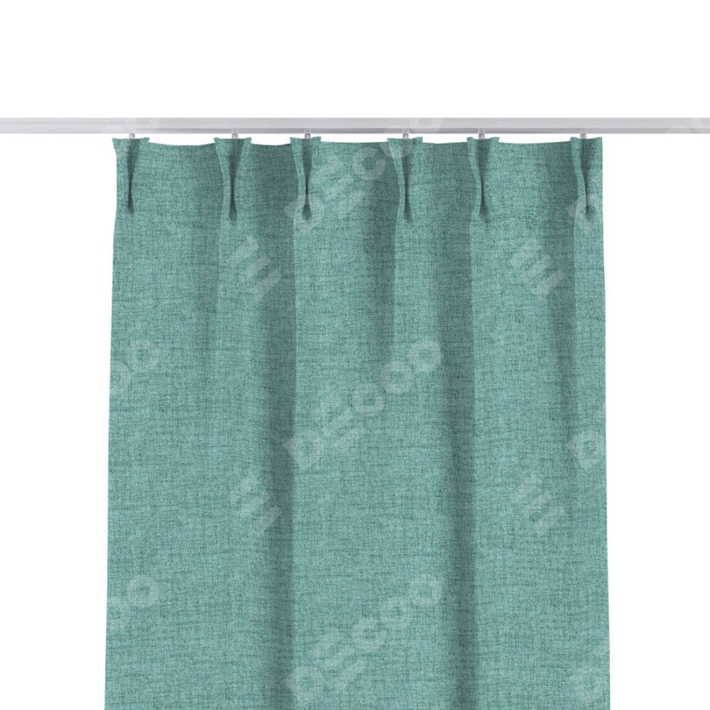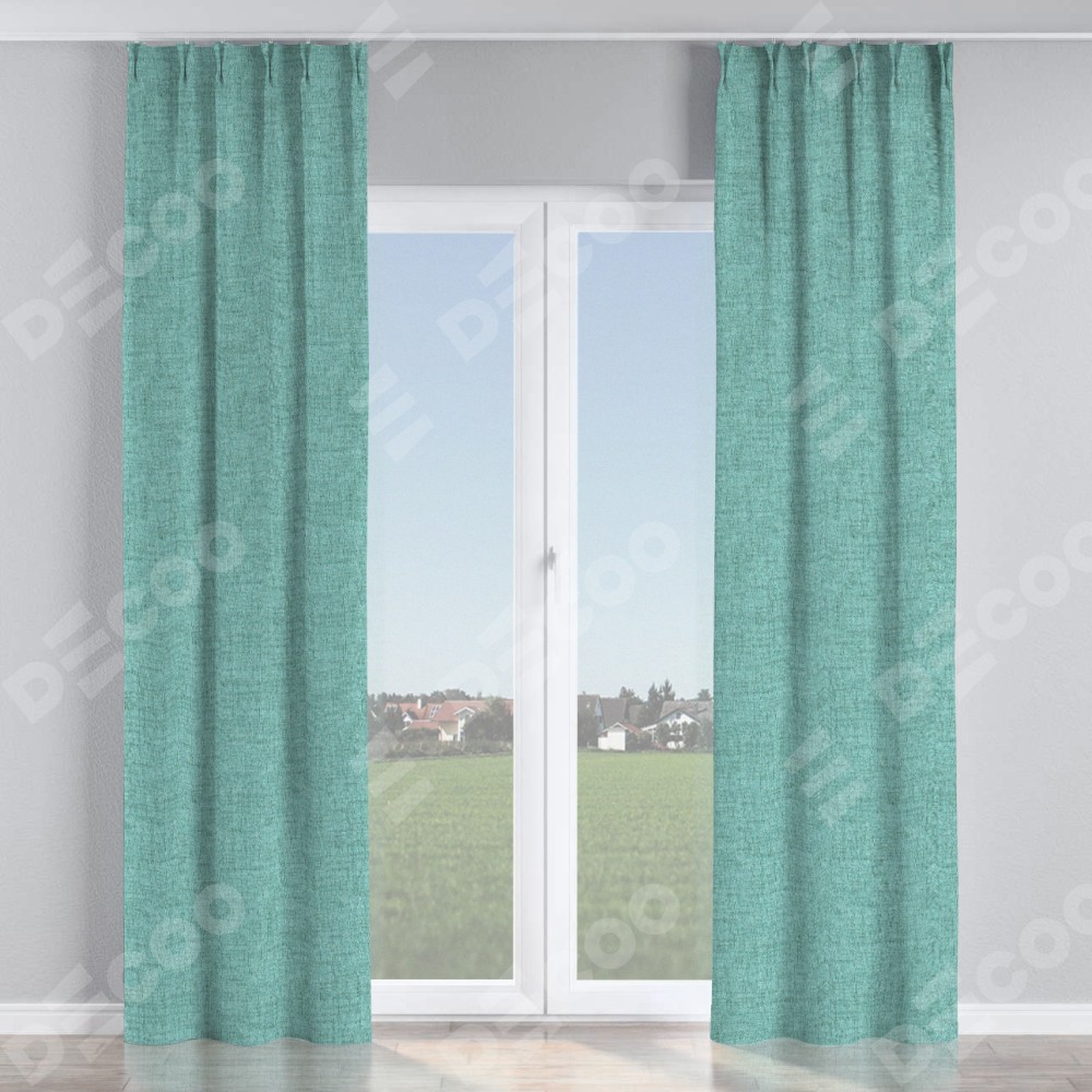 Комплект прямых штор, от производителя «Cortin», пошиты из ткани рогожка димаут аквамариновый крайола, артикул ткани 91023. С изнаночной стороны в верхней части штор пристрачивается шторная лента с декоративными складками «Кустик». Для создания элегантных складок прямые шторы шьются по стандарту с коэффициентом 1:2 (на 100 см. ширины проёма 200 см. ширины ткани).