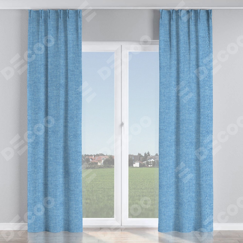 Комплект прямых штор, от производителя «Cortin», пошиты из ткани рогожка димаут голубой, артикул ткани 91025. С изнаночной стороны в верхней части штор пристрачивается шторная лента с декоративными складками «Кустик». Для создания элегантных складок прямые шторы шьются по стандарту с коэффициентом 1:2 (на 100 см. ширины проёма 200 см. ширины ткани).